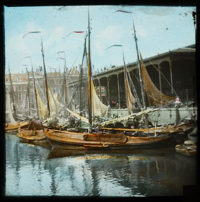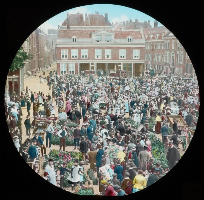 Handgekleurde glasdia van bloemenmarkt te Rotterdam