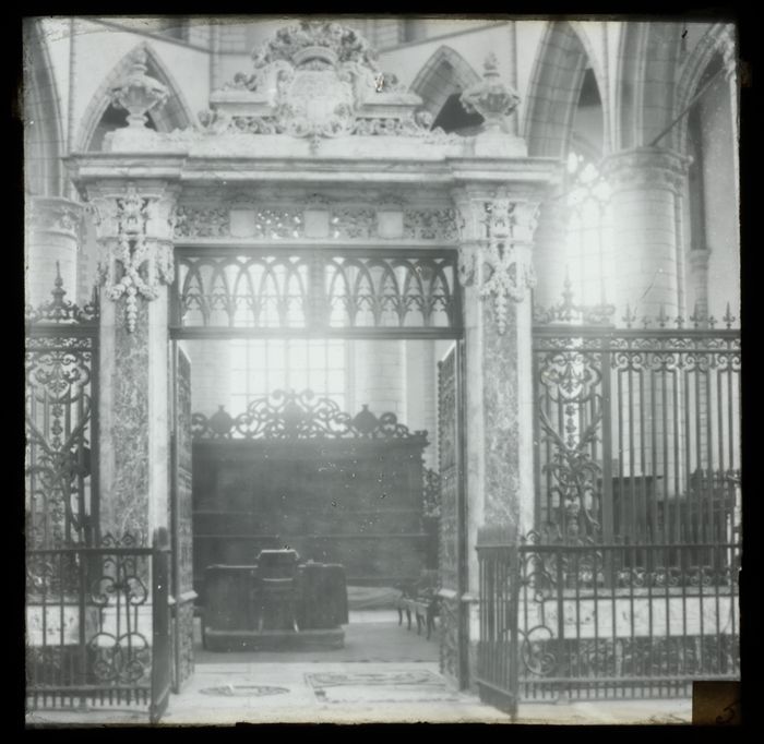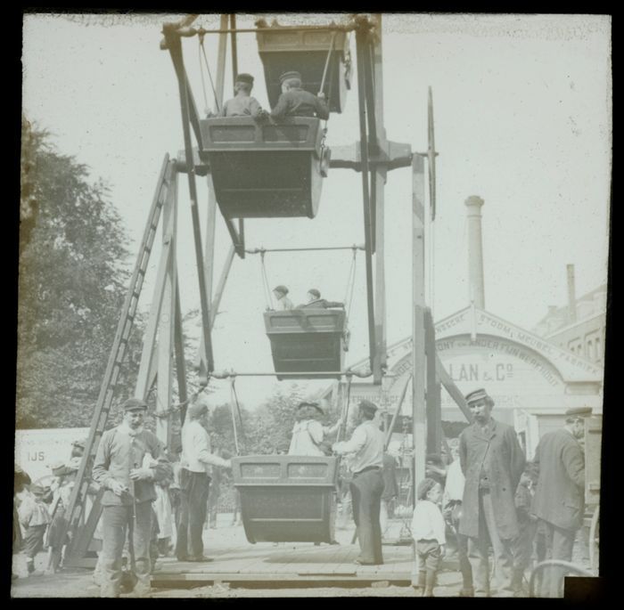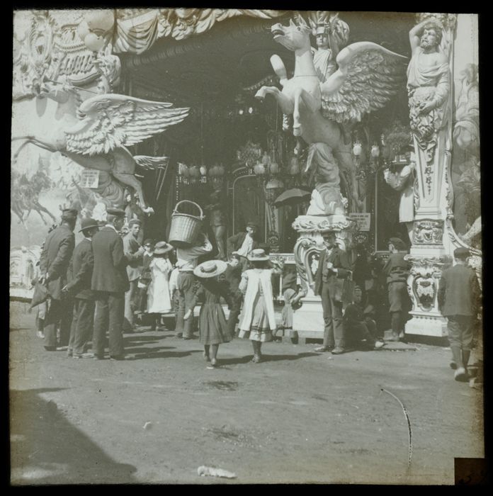 Glasdia van een kermis, grote entree van draaimolen (?)