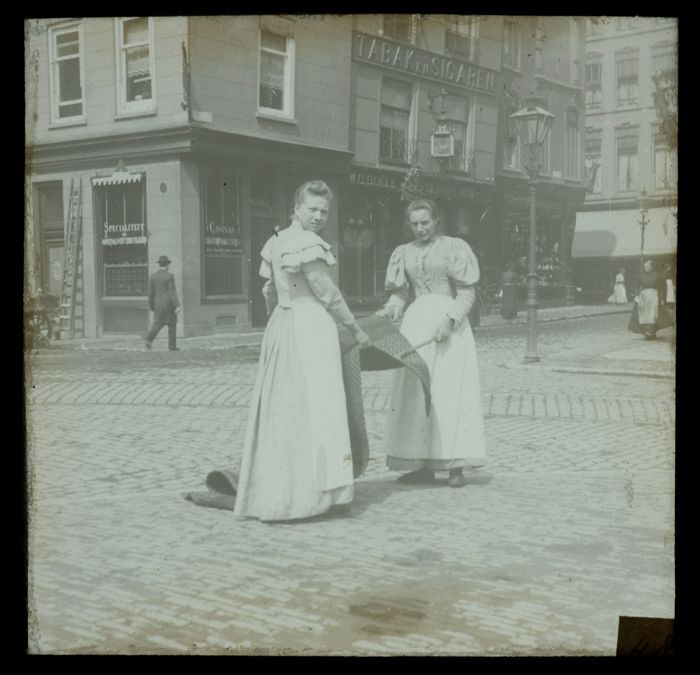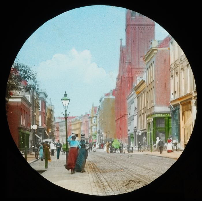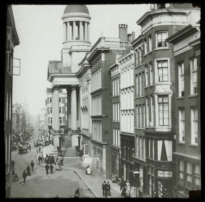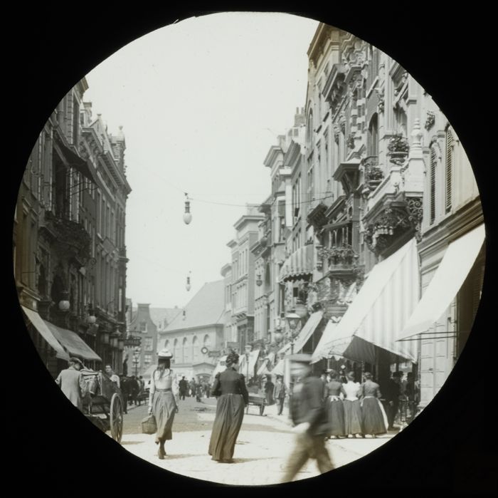 Glasdia van de Korte Hoogstraat met winkelend publie...