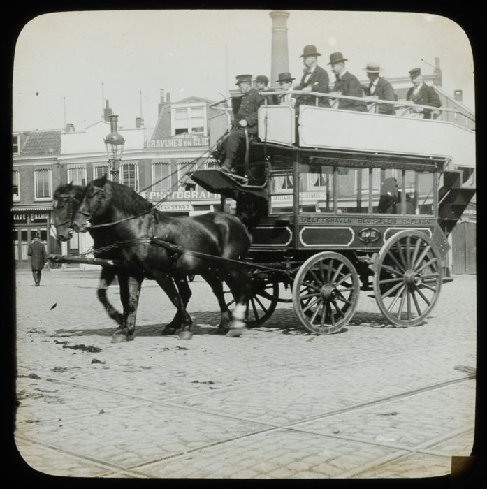 Glasdia van Omnibus met paard, tramrails op voorgrond