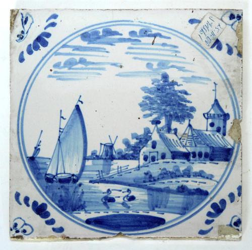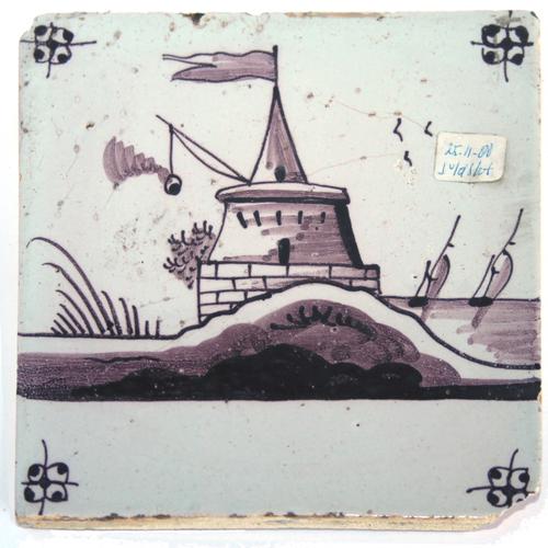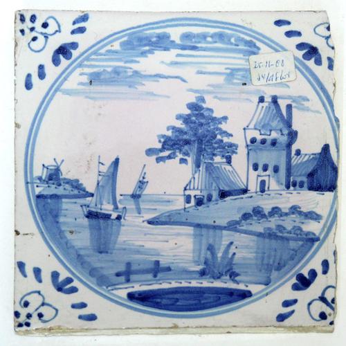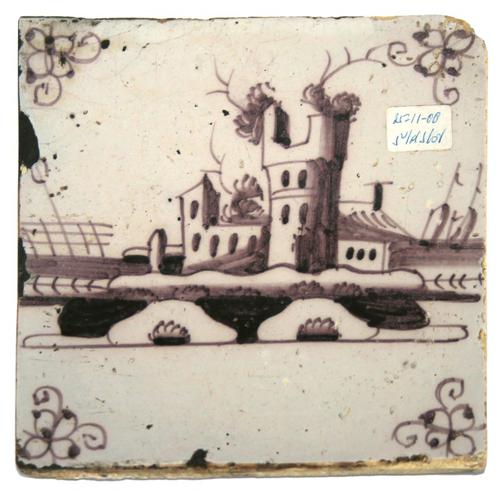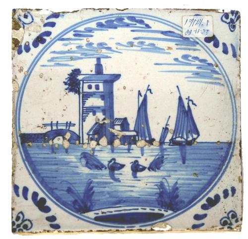 Landschap tegel. Huizen met wachttoren en kerk langs...