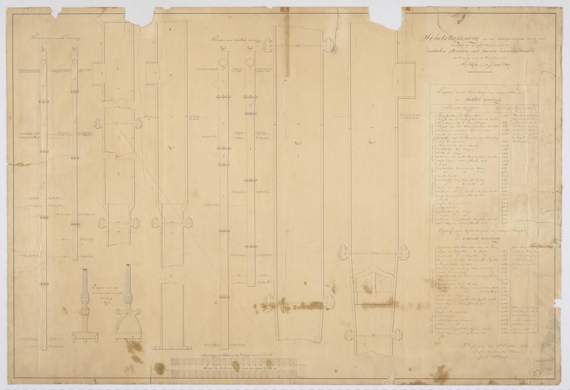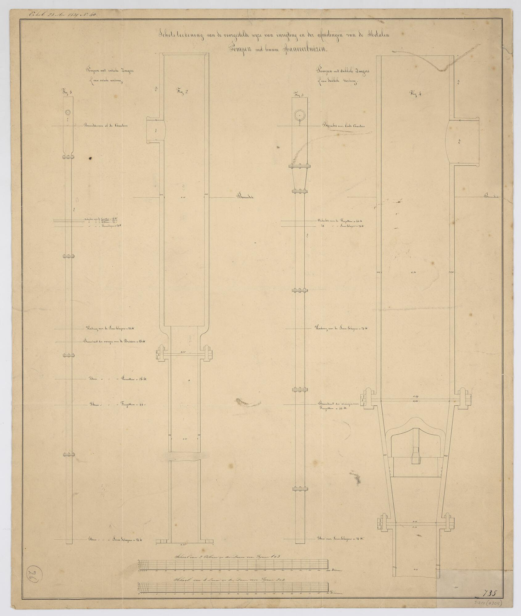 Maattekening van de ijzeren knieveren van linieschep...