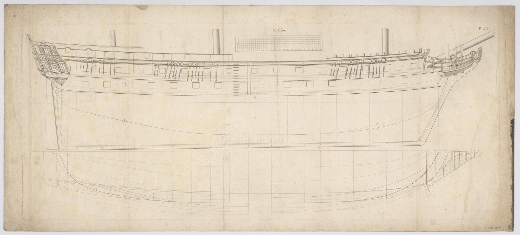 Lijnenplan van een oorlogsschip van 80 stukken