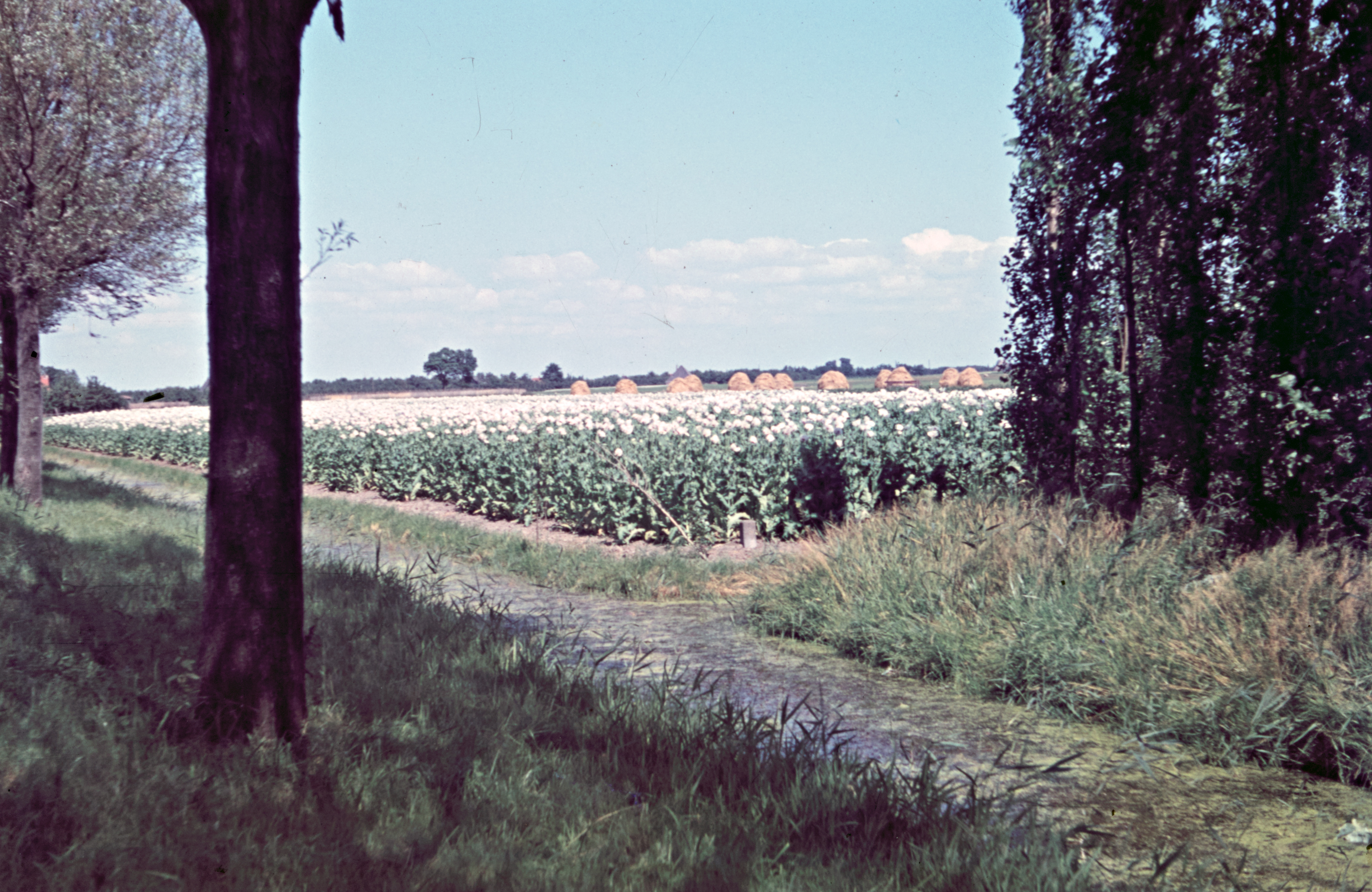Bloemen veld met bundels hooi in de verte