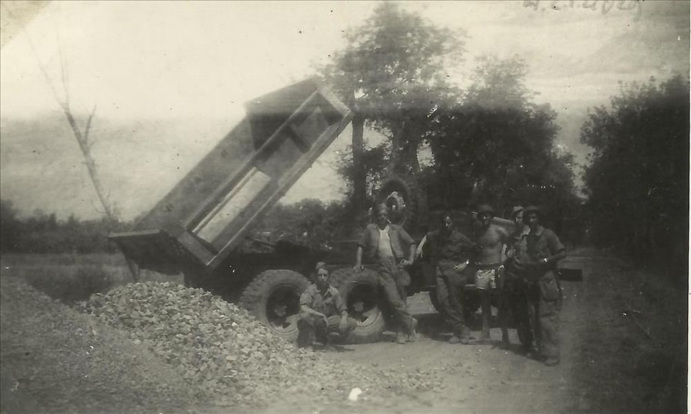 Indië; militairen met kipwagen, aanleg nieuwe weg Ne...