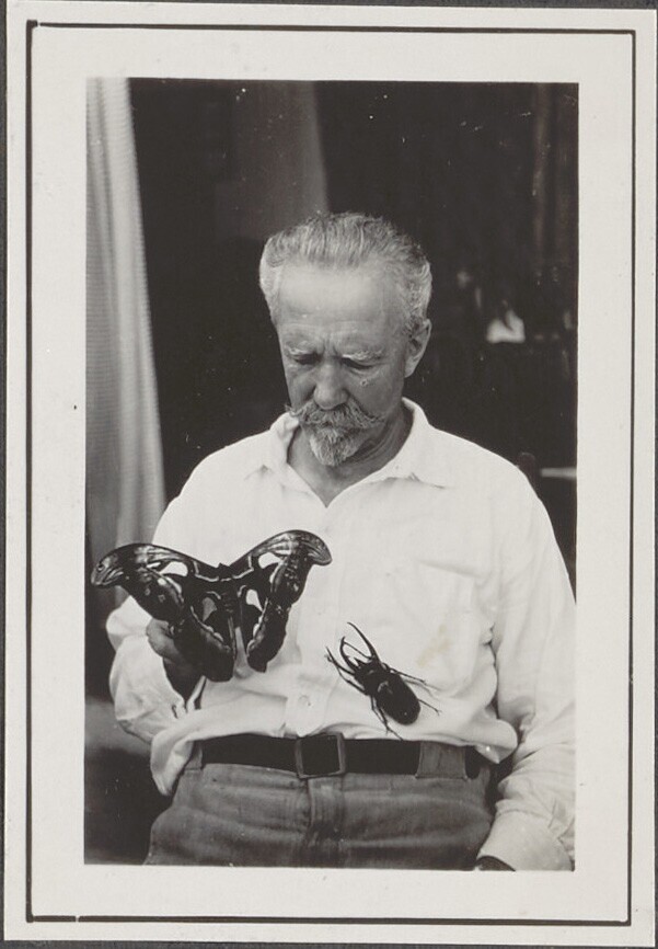 Man met een atlasvlinder en een atlaskever