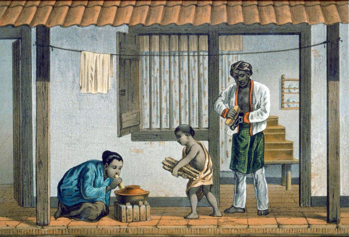Een komfoortje met bak (no 4) en manden om te stomen...