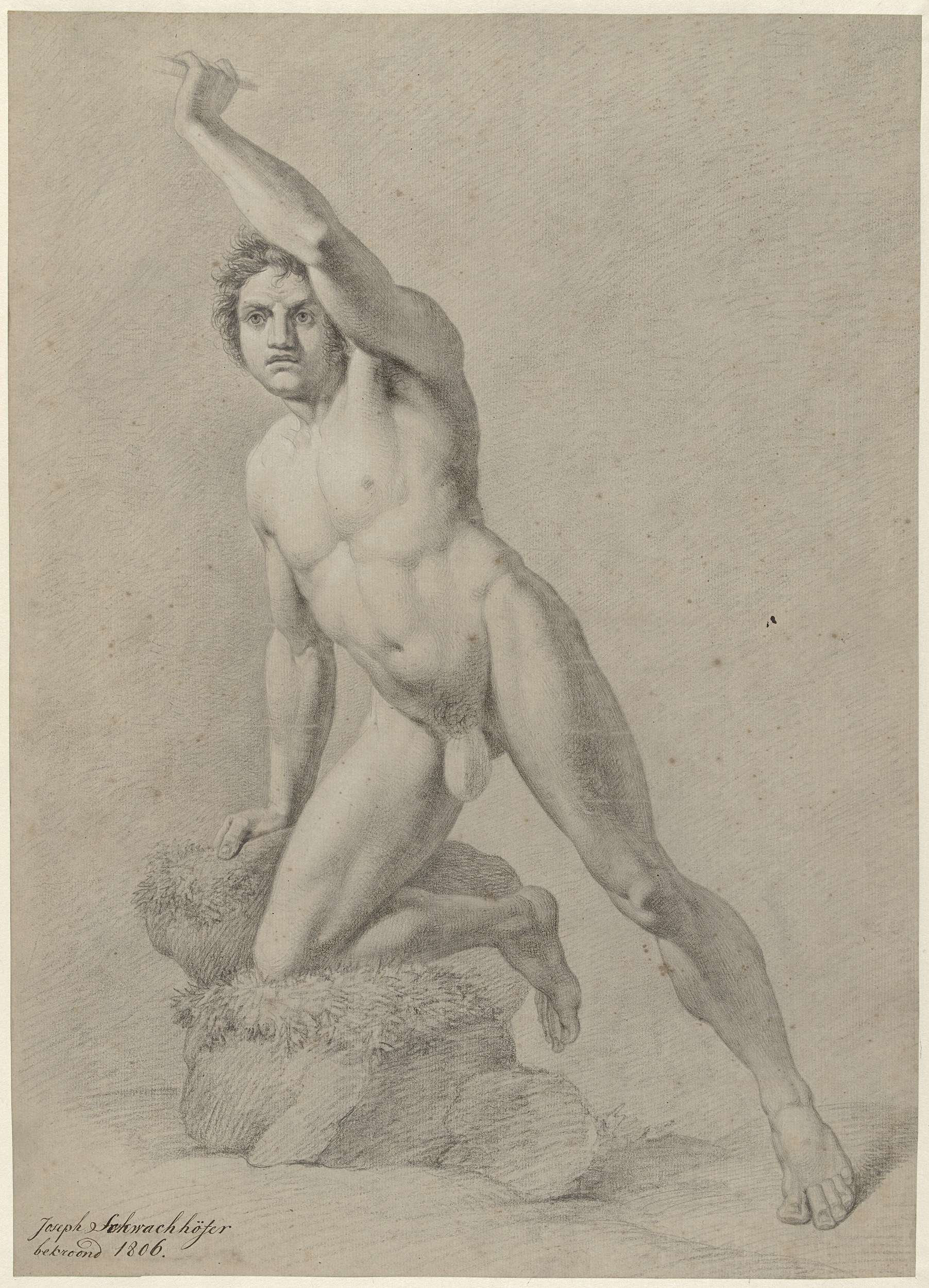 Mannelijk naakt, zittend op een blok, met speer en s...