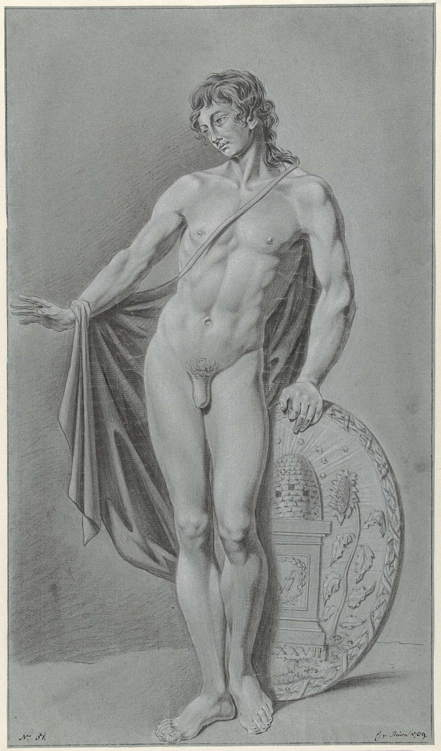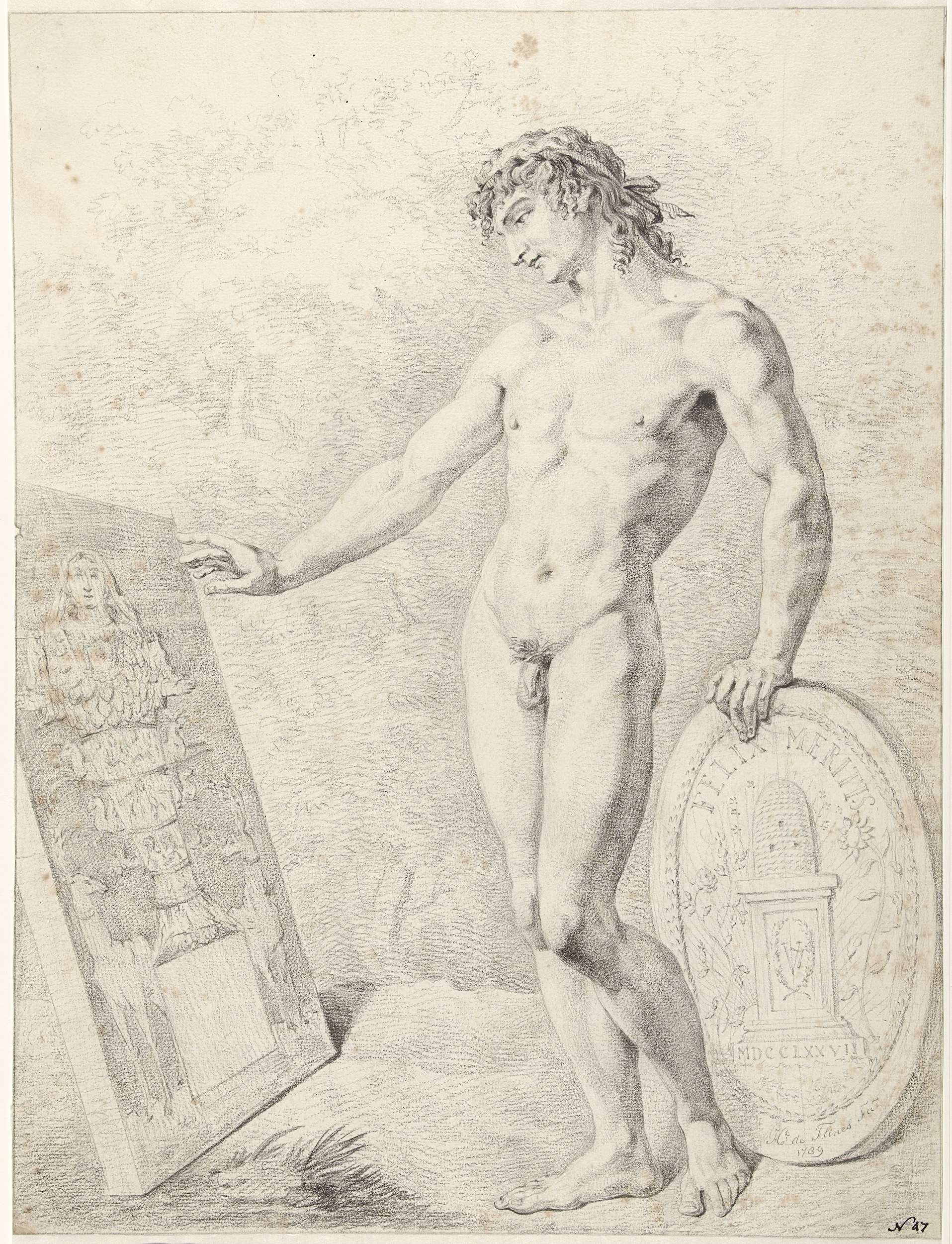 Staand mannelijk naakt met een schild waarop het emb...