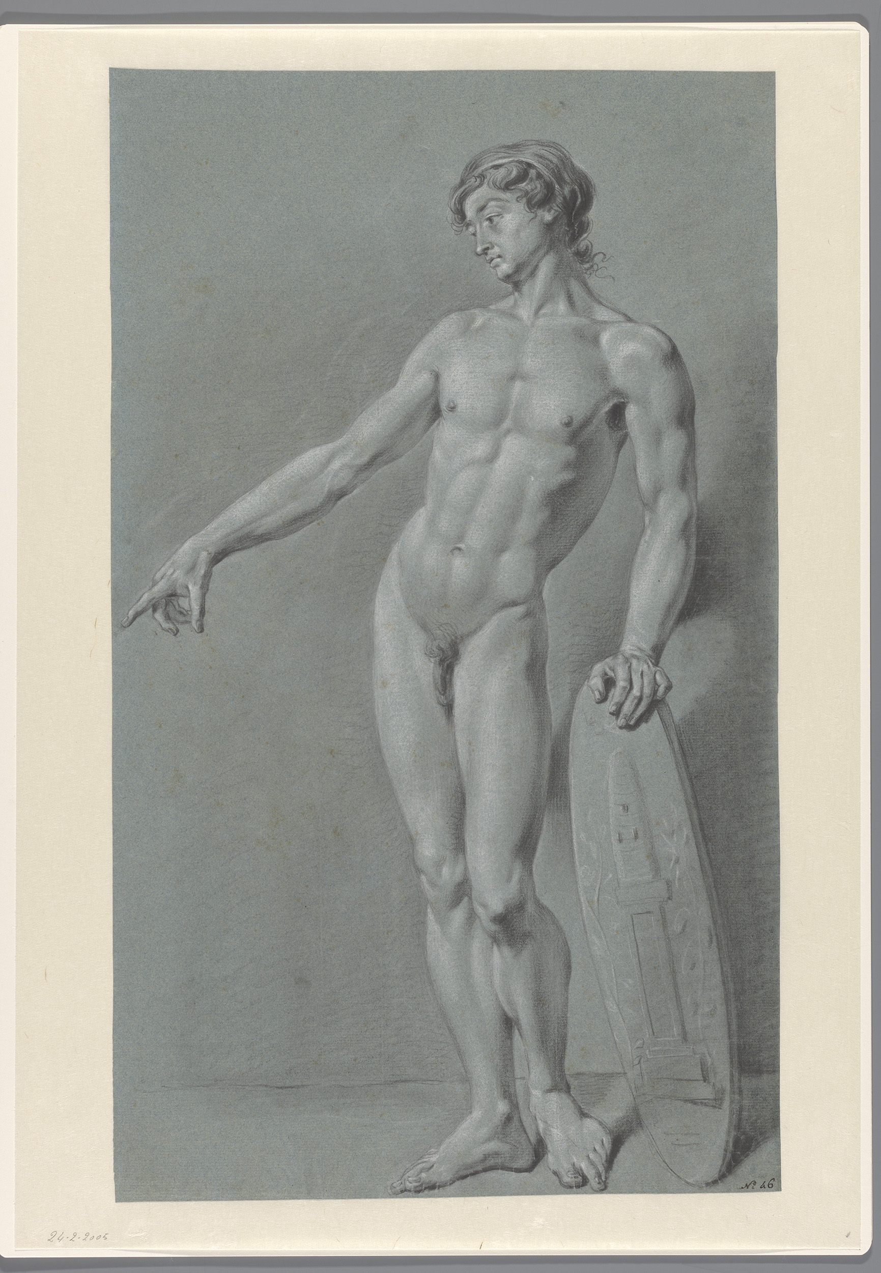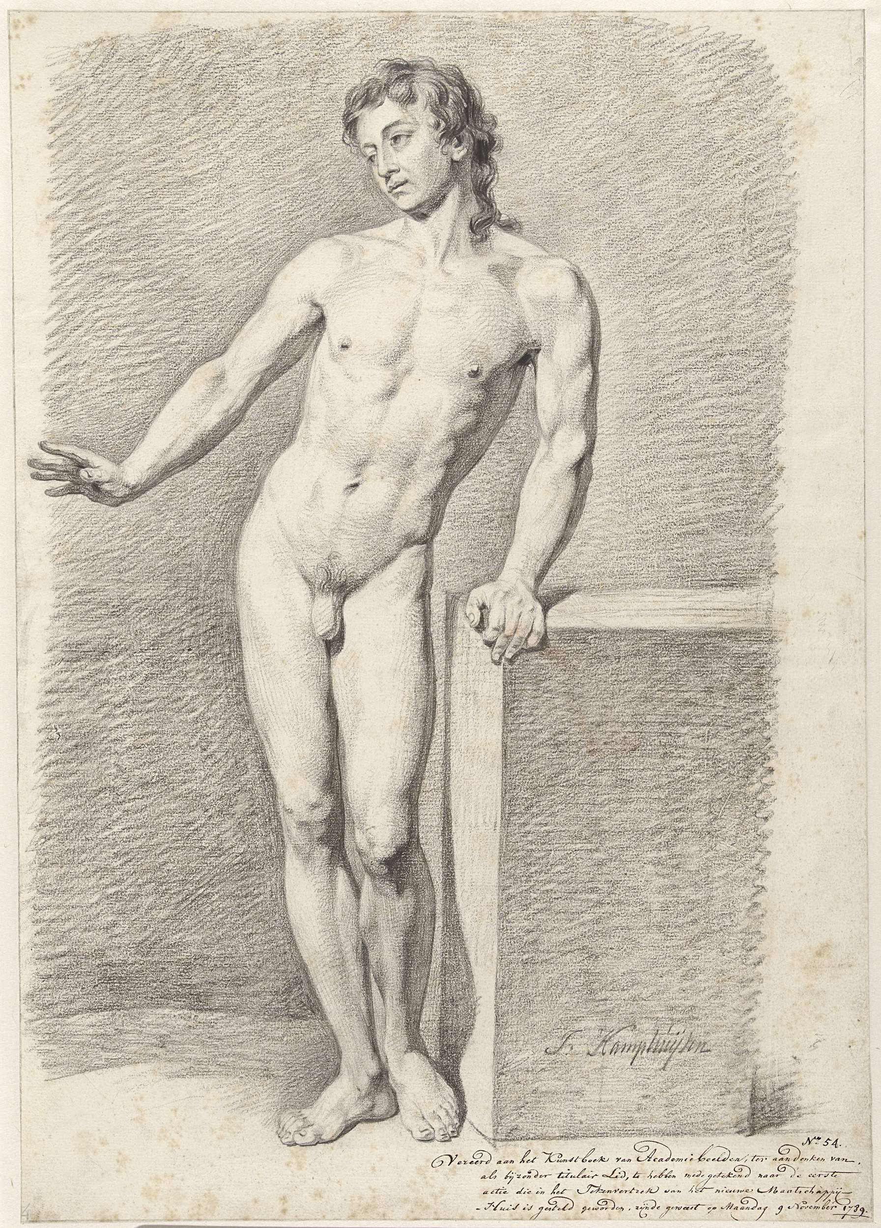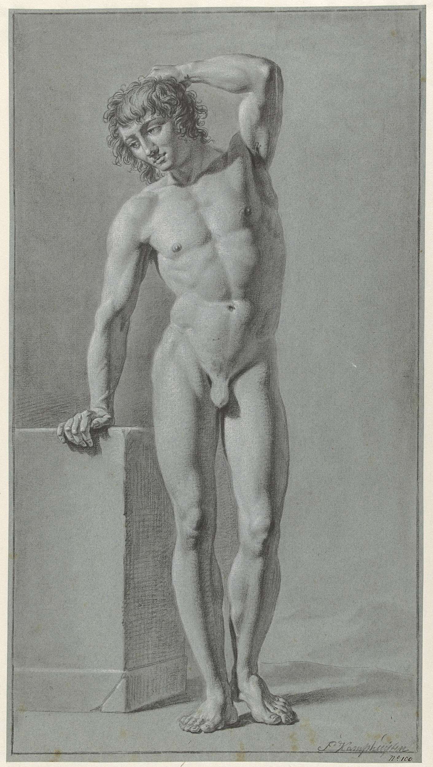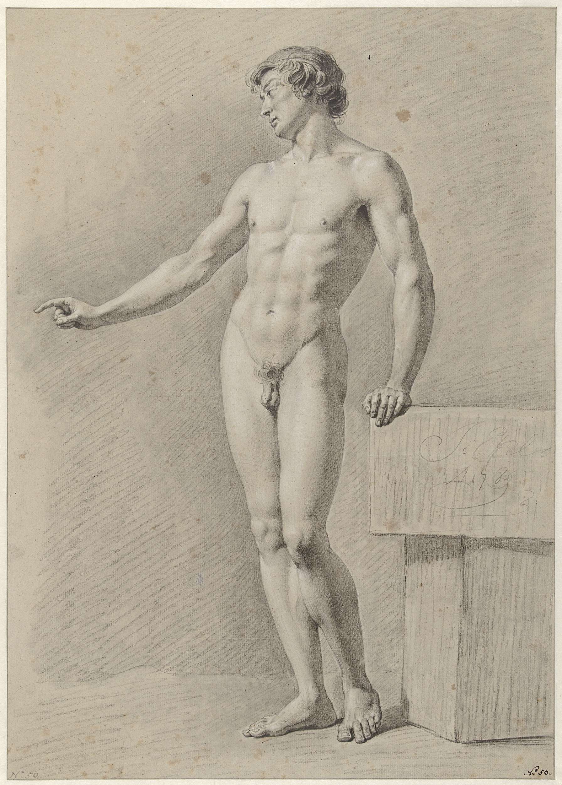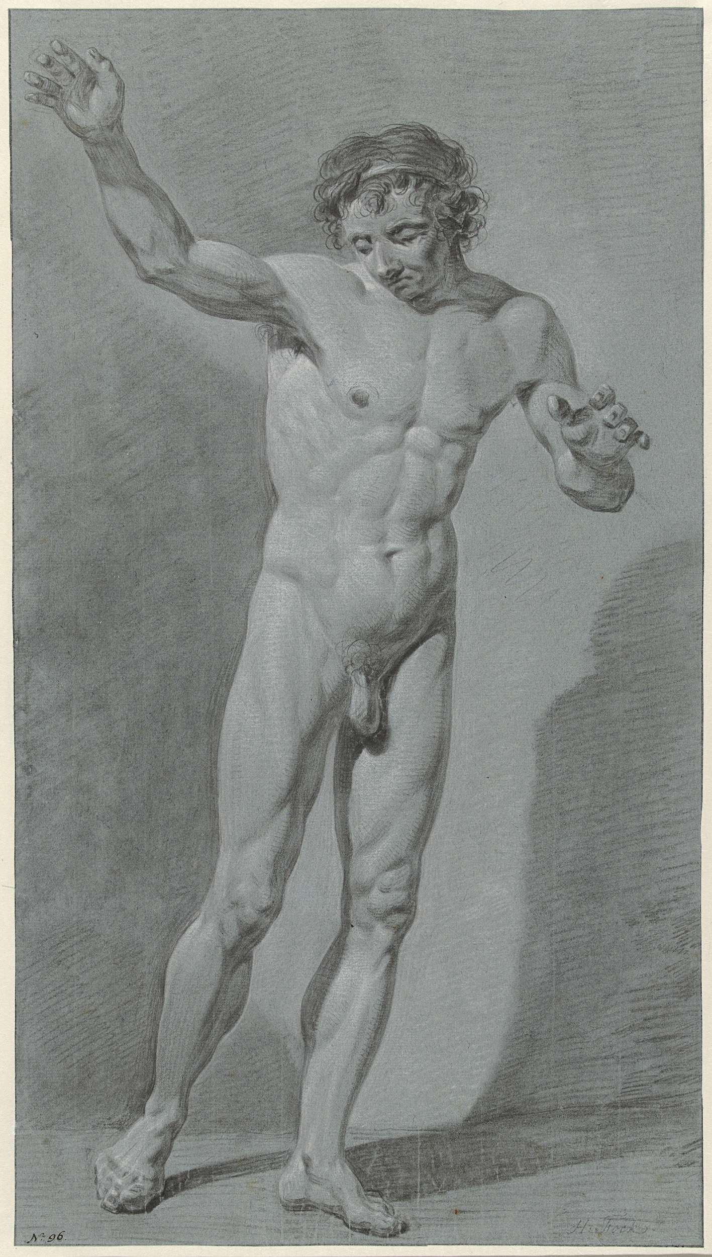 Staand mannelijk naakt, van voren, de linkerarm gest...