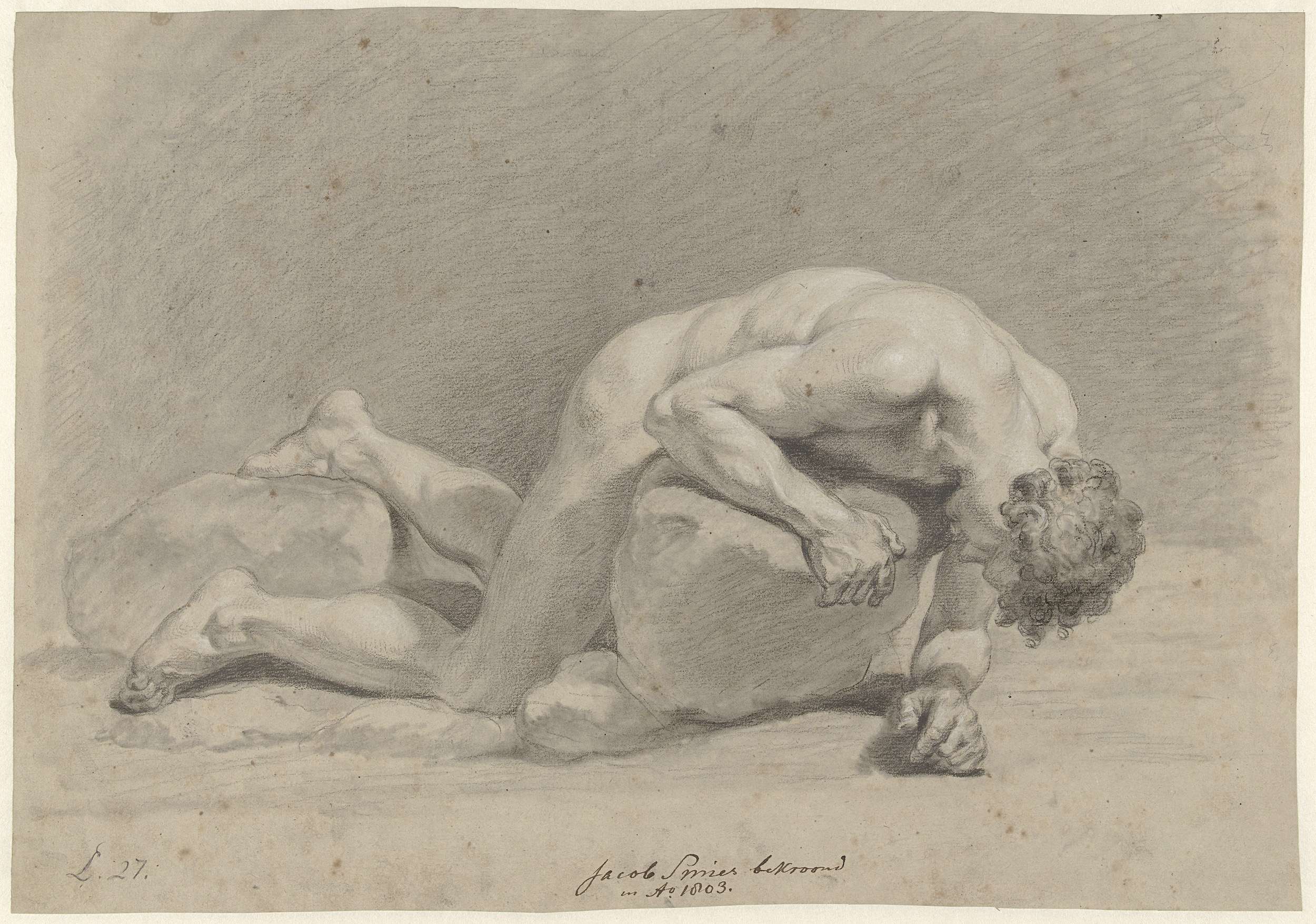 Zittend mannelijk naakt, half naar links, op de rug ...