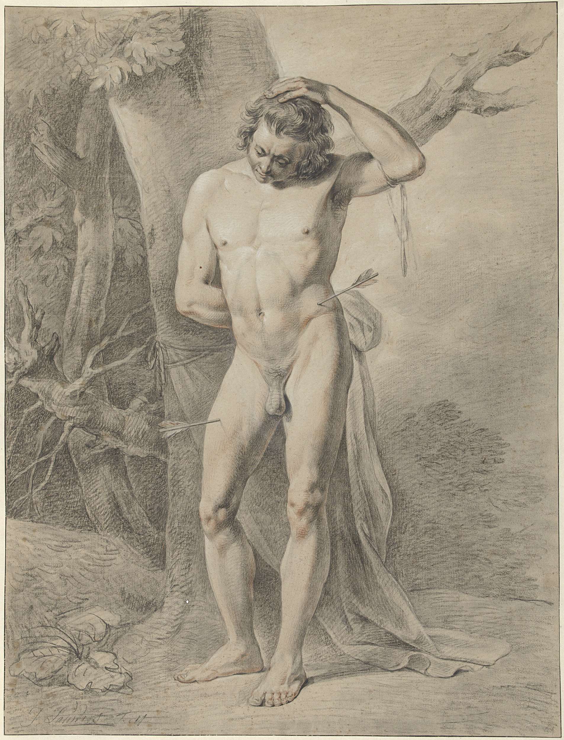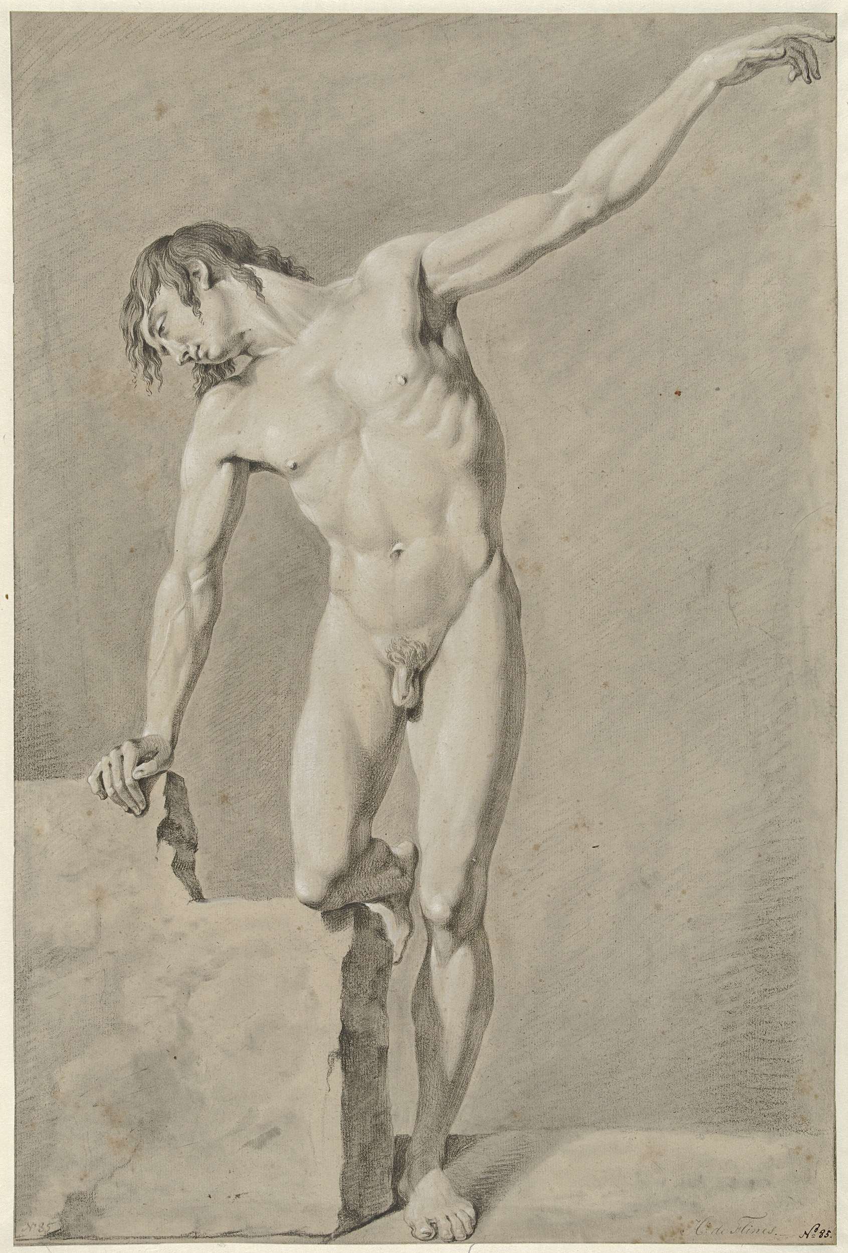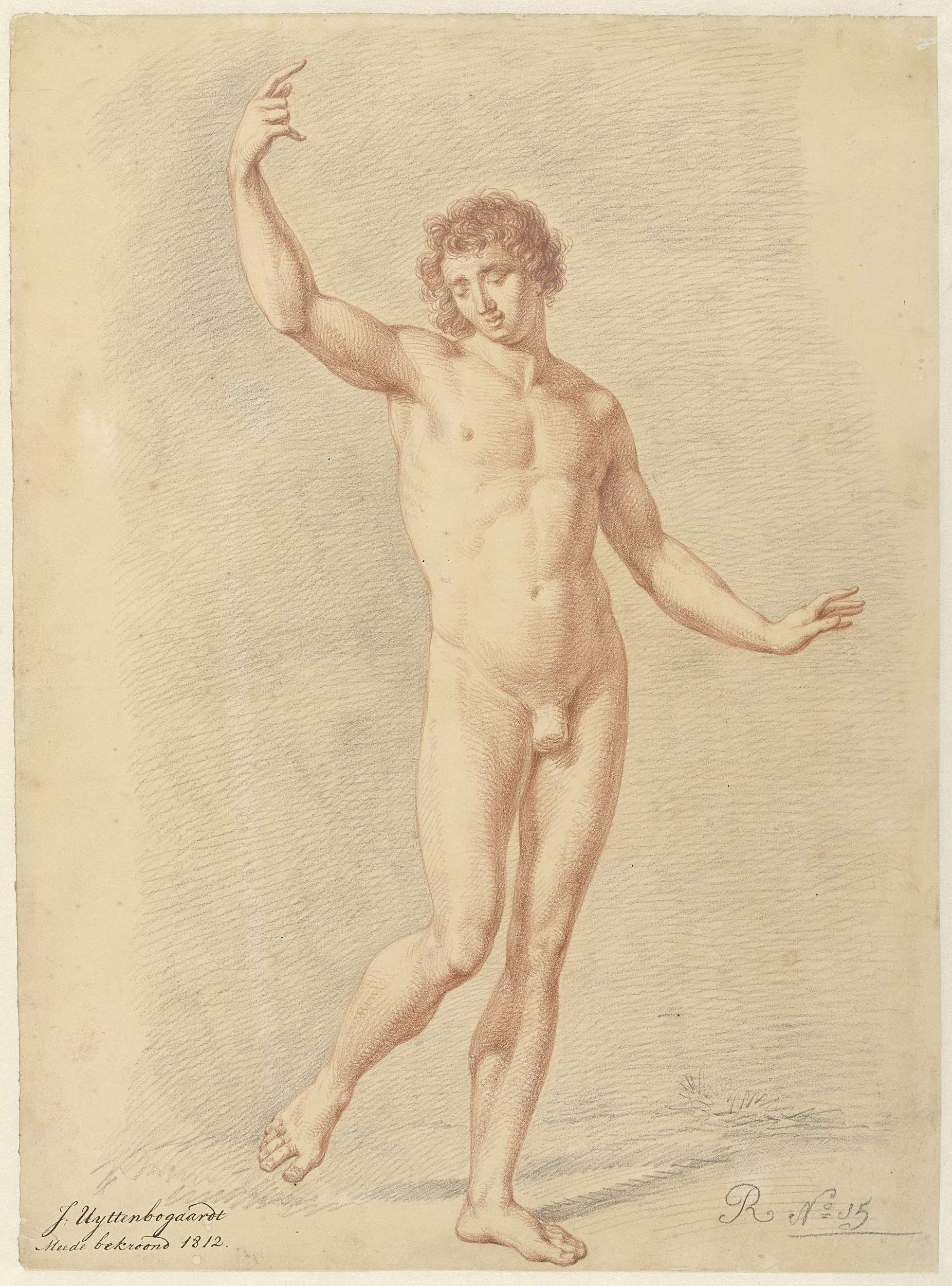 Staand mannelijk naakt, de linkerarm geheven
