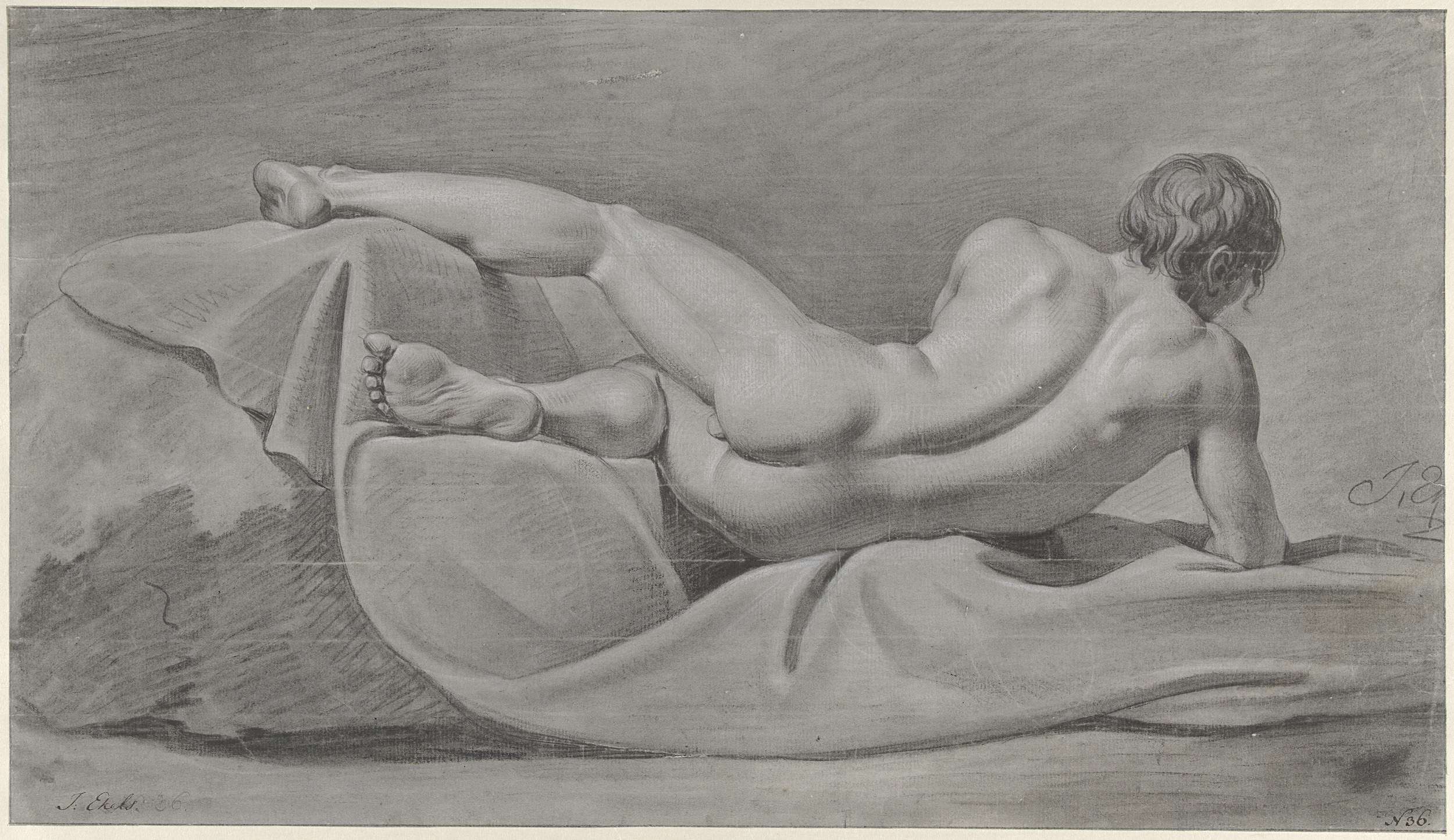 Liggend mannelijk naakt, op de rug gezien