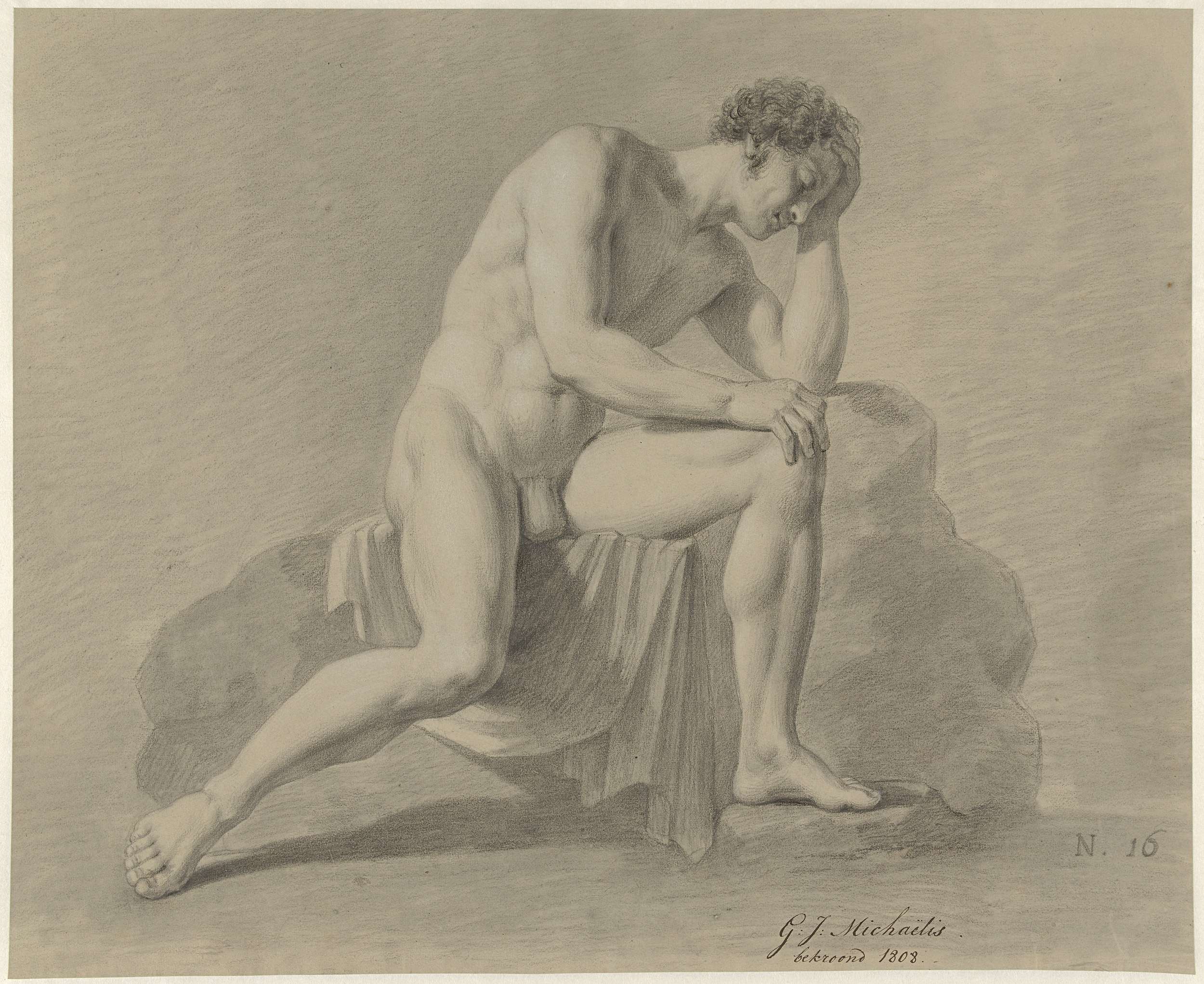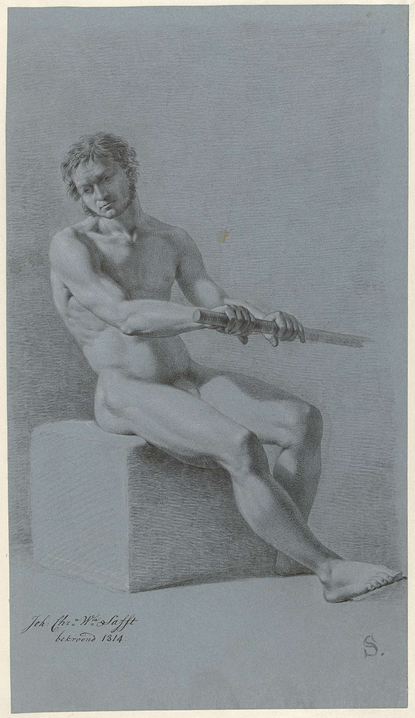 Zittend mannelijk naakt, de hand op het handvat van ...