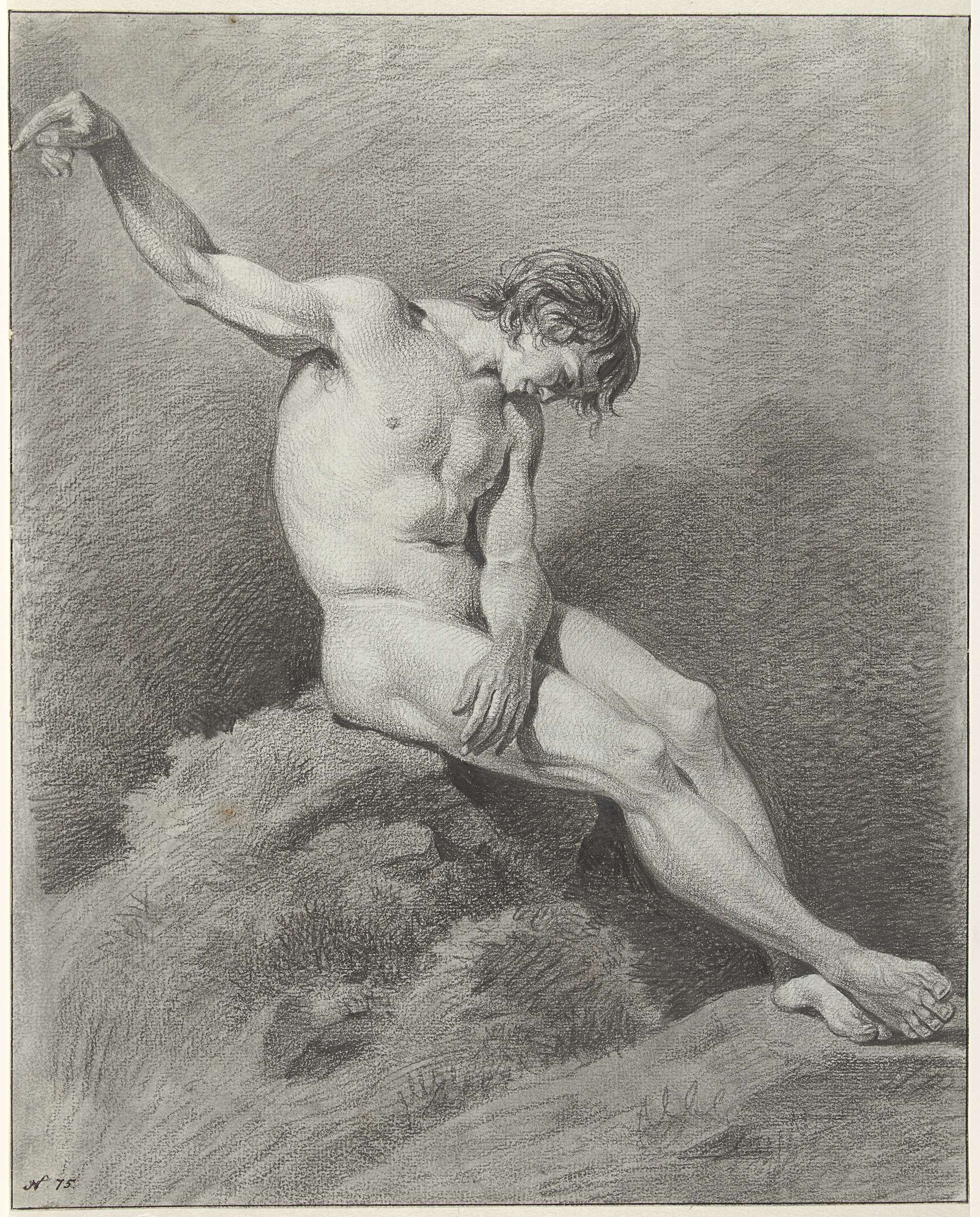Zittend mannelijk naakt, naar rechts met gestrekt been