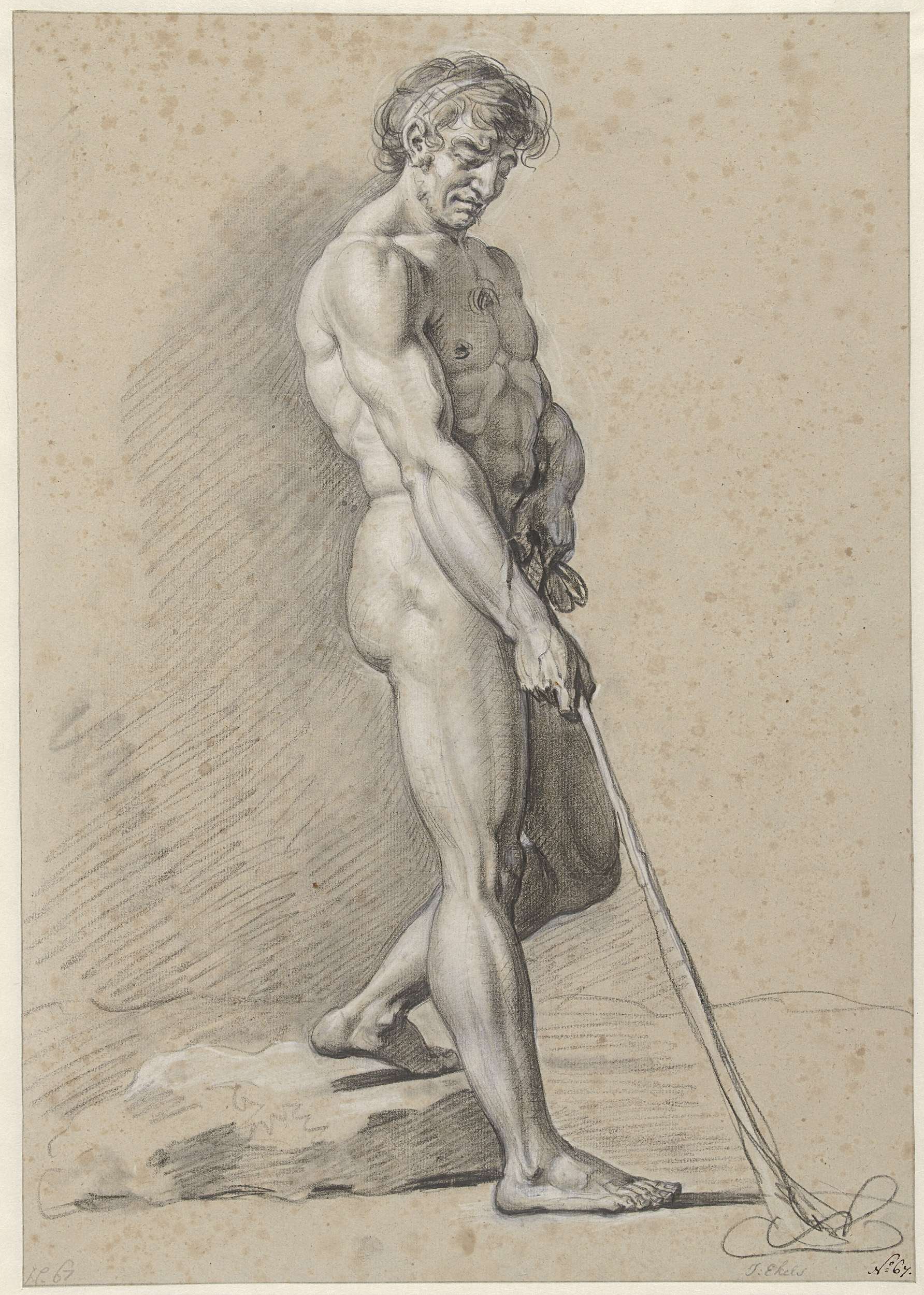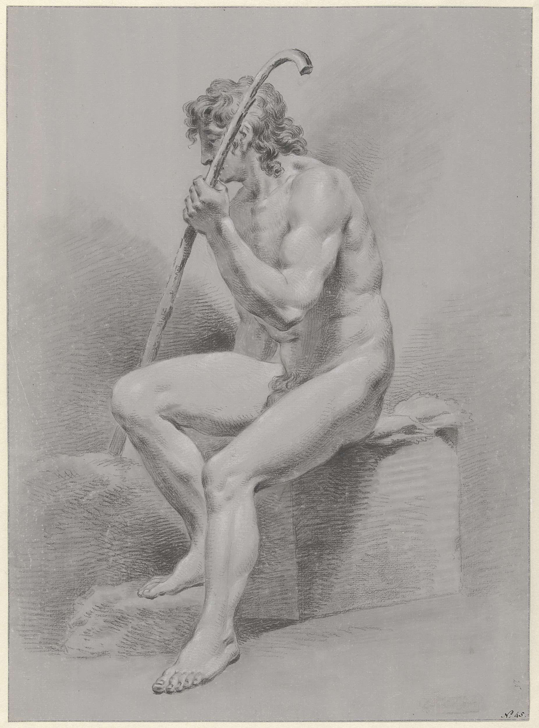 Zittend mannelijk naakt met herdersstaf