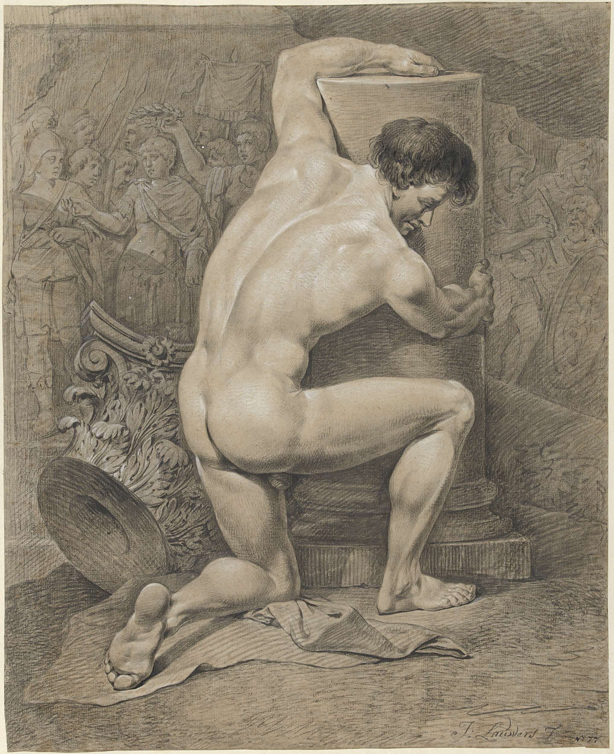 Mannelijk naakt, genield op de linkerknie, naar links