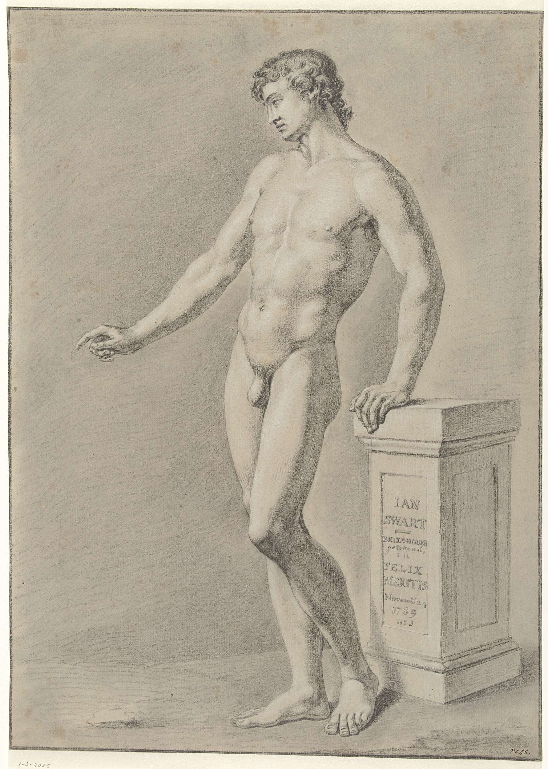 Staand mannelijk naakt, leunend tegen een blok