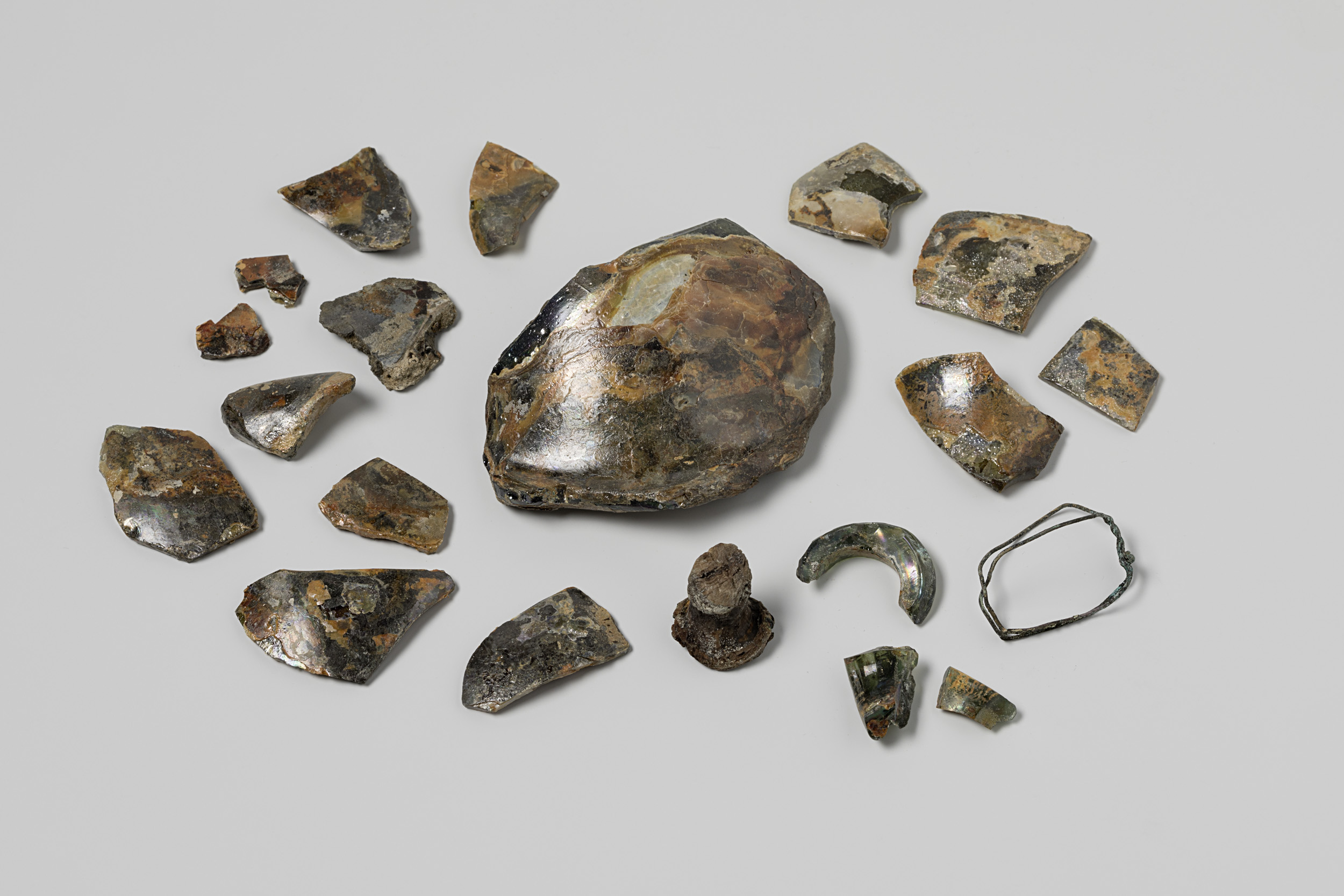 Glasscherven van wijnflessen uit het wrak van de in ...