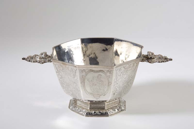 Achthoekige brandewijnskom met op de zijden een jong...