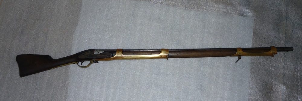 Geweer, zgn. vuursteenmusket, met bajonet, van hout,...