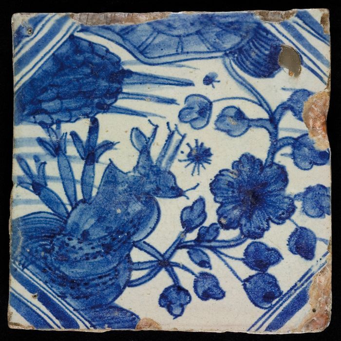 Tegel van tegelveld van vier tegels, blauw op wit, '...