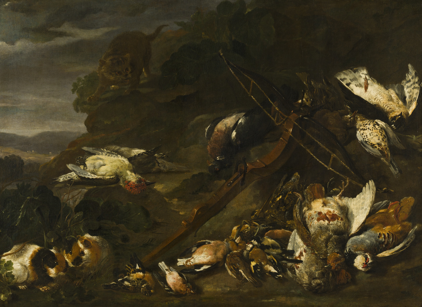 Stilleven met kruisboog en dode vogels