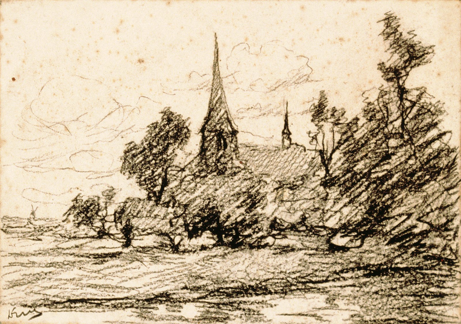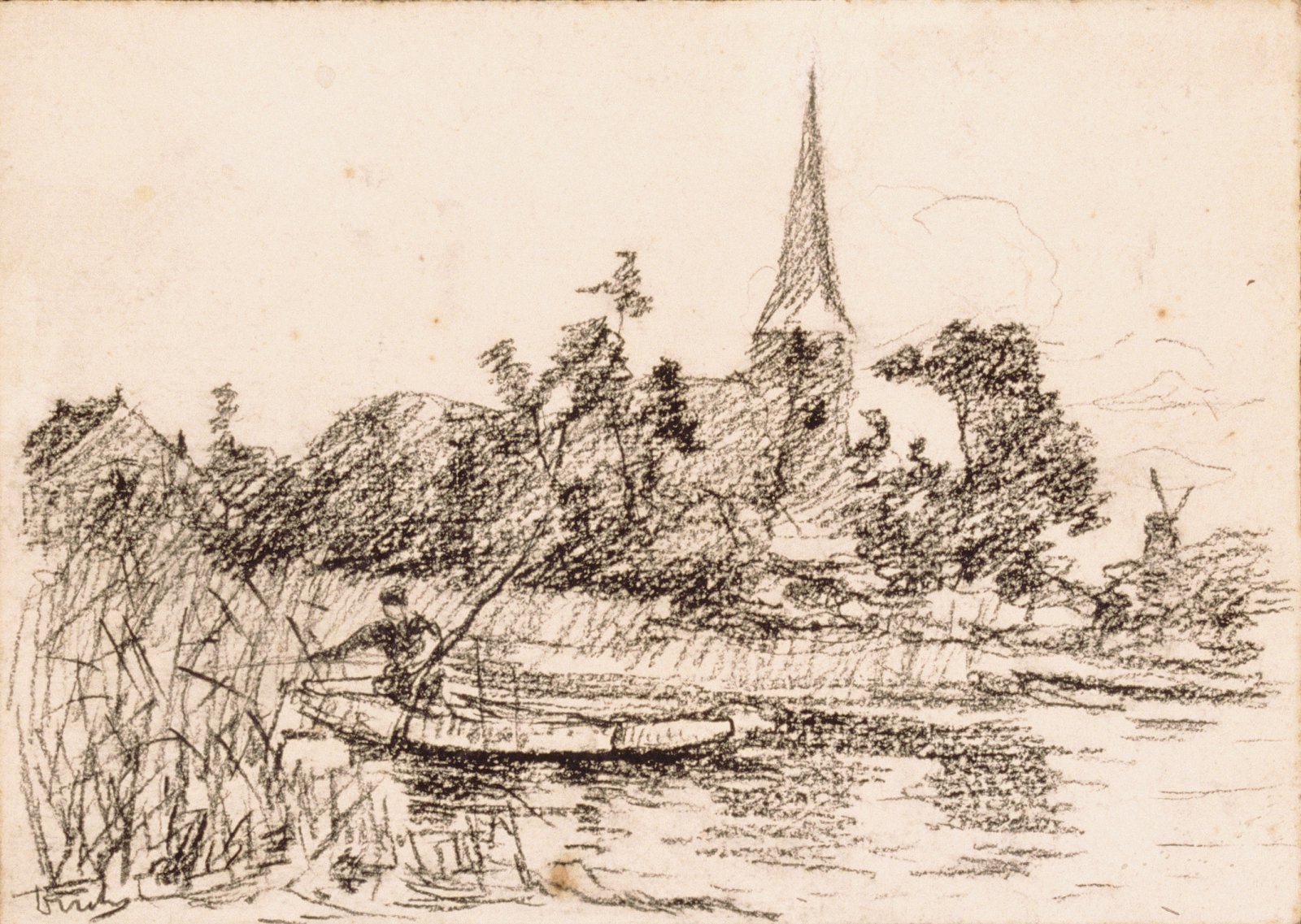 Kerk aan de overkant van een vaart (recto); twee zei...