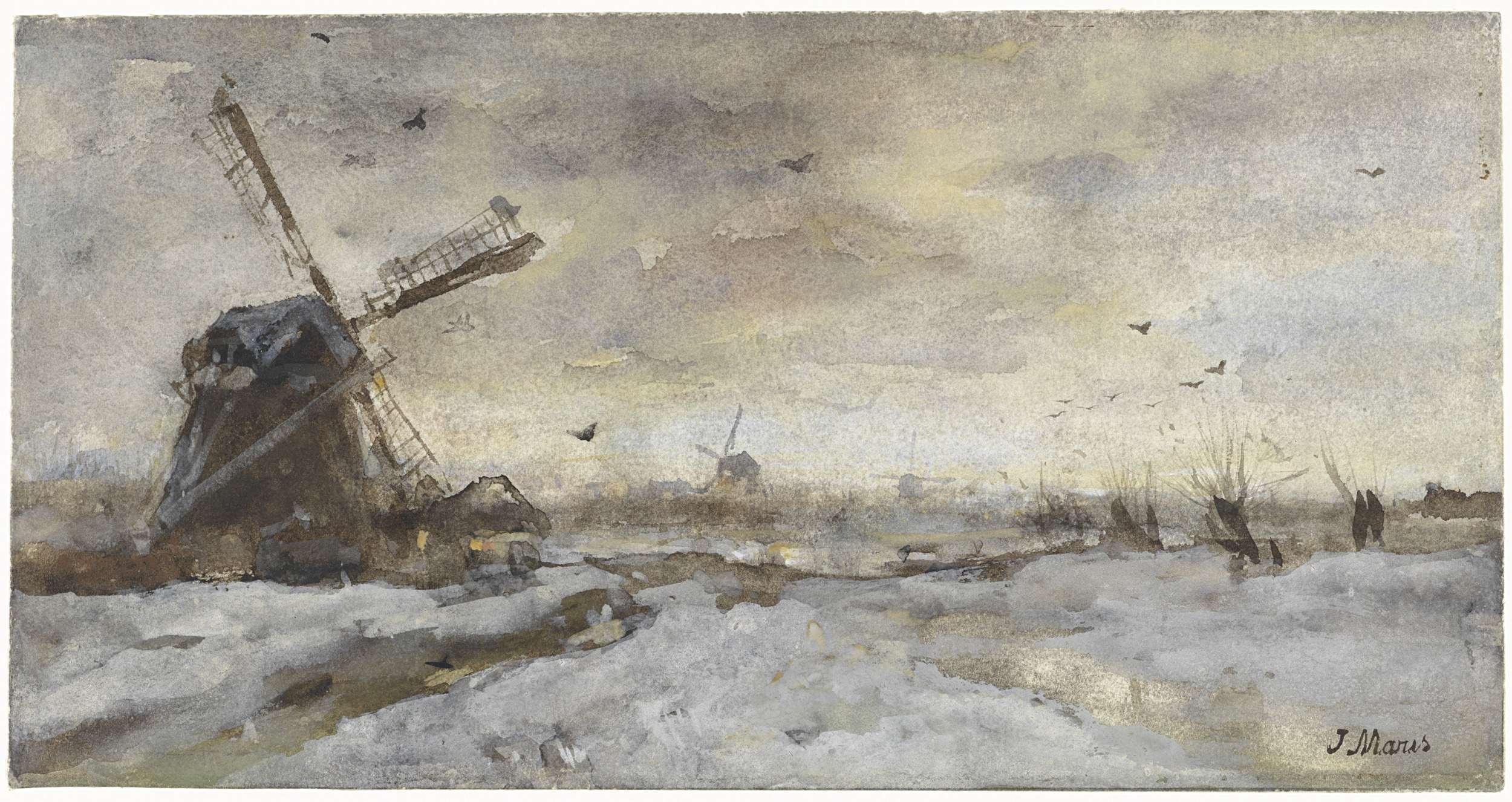 Landschap met molen in de sneeuw