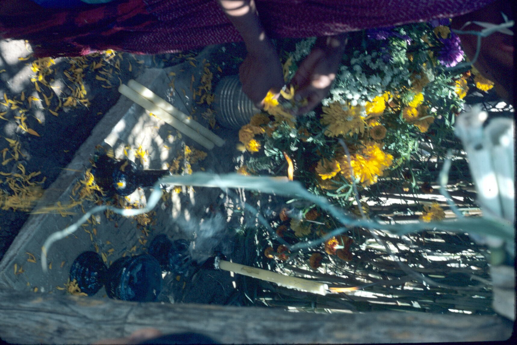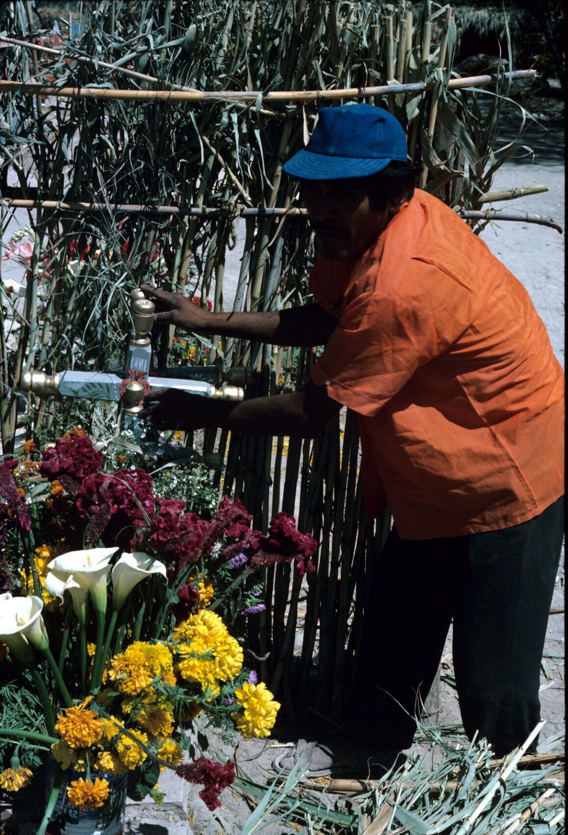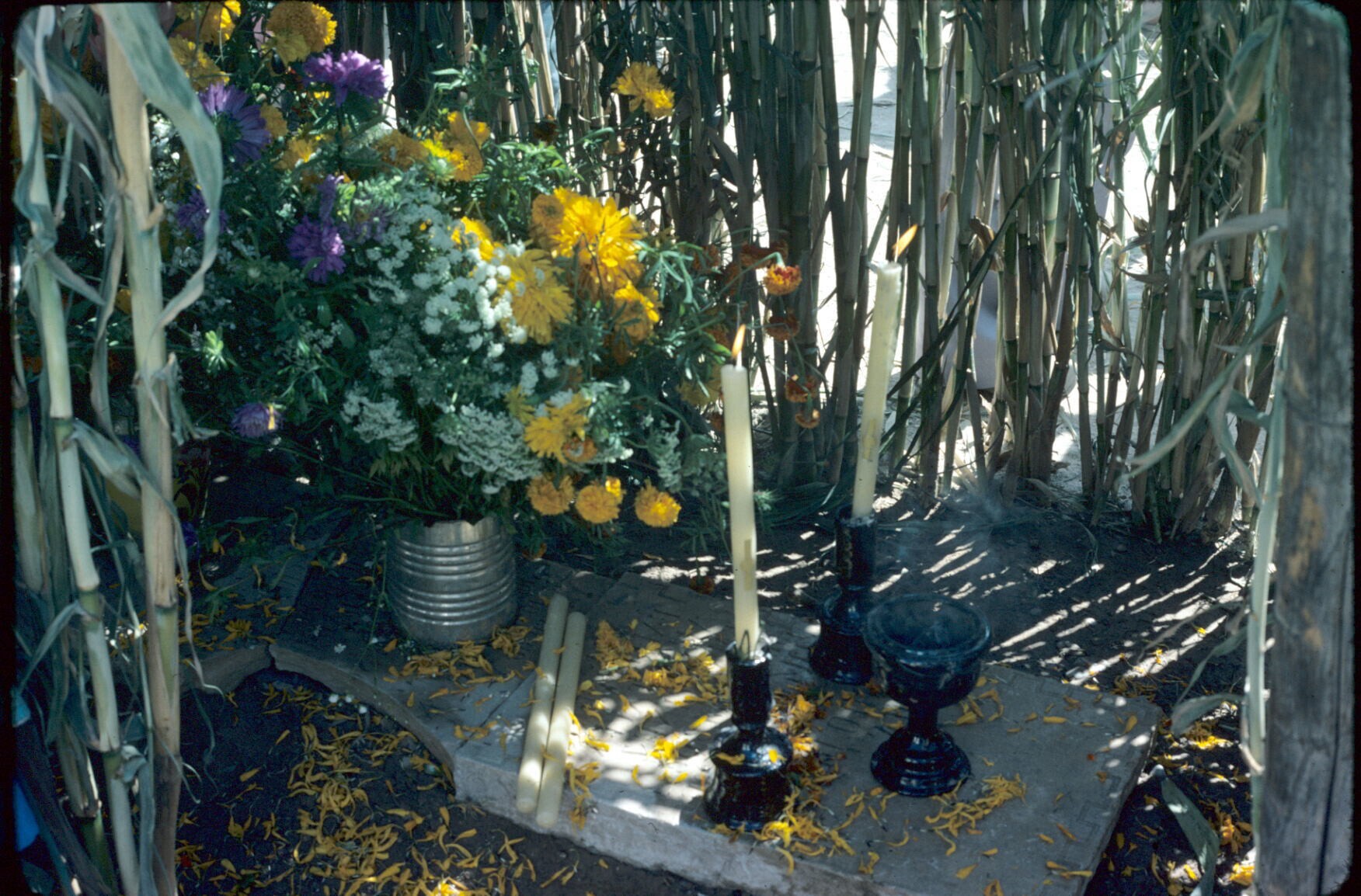 vrouw bij graf met bloemen; NB incensario (wierookbr...