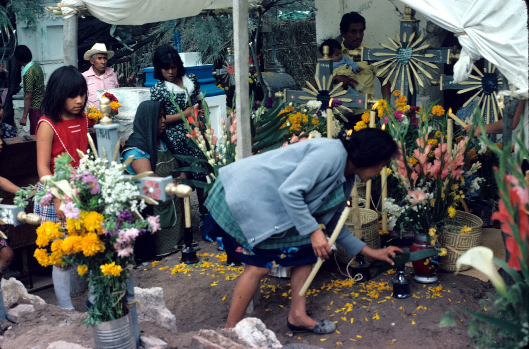 vrouwen, bloemen en kaarsen plaatsend op kerkhof