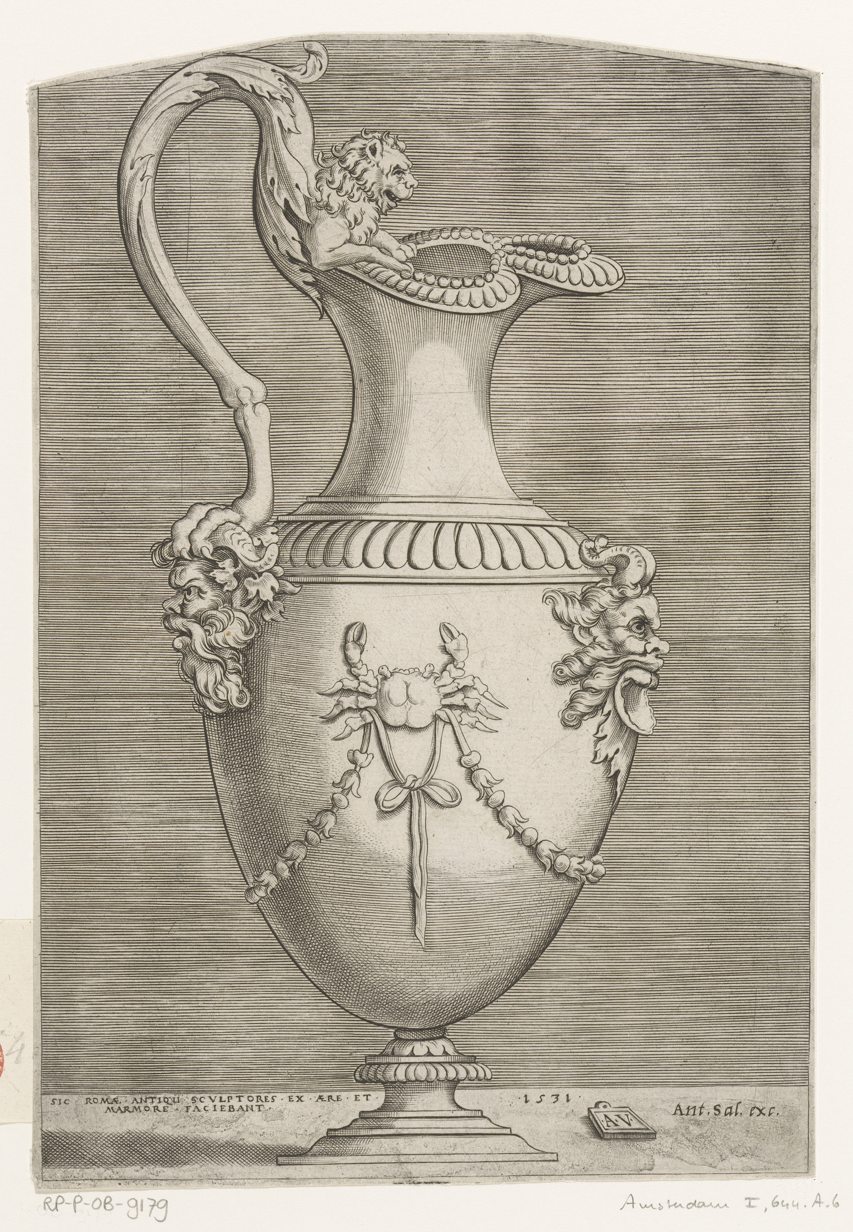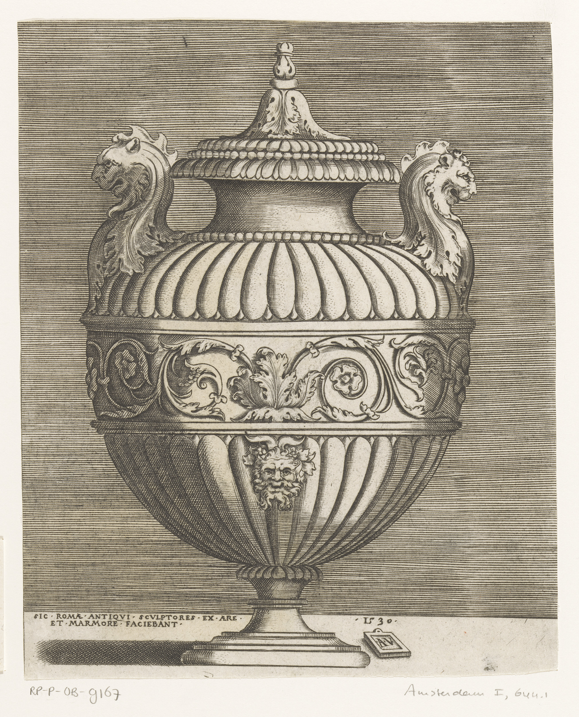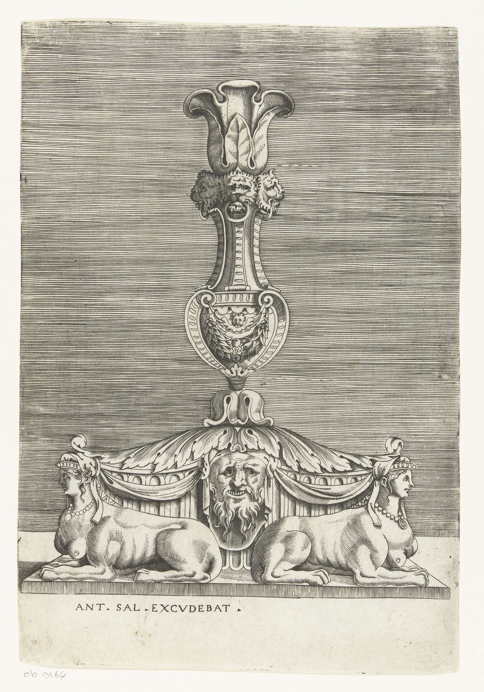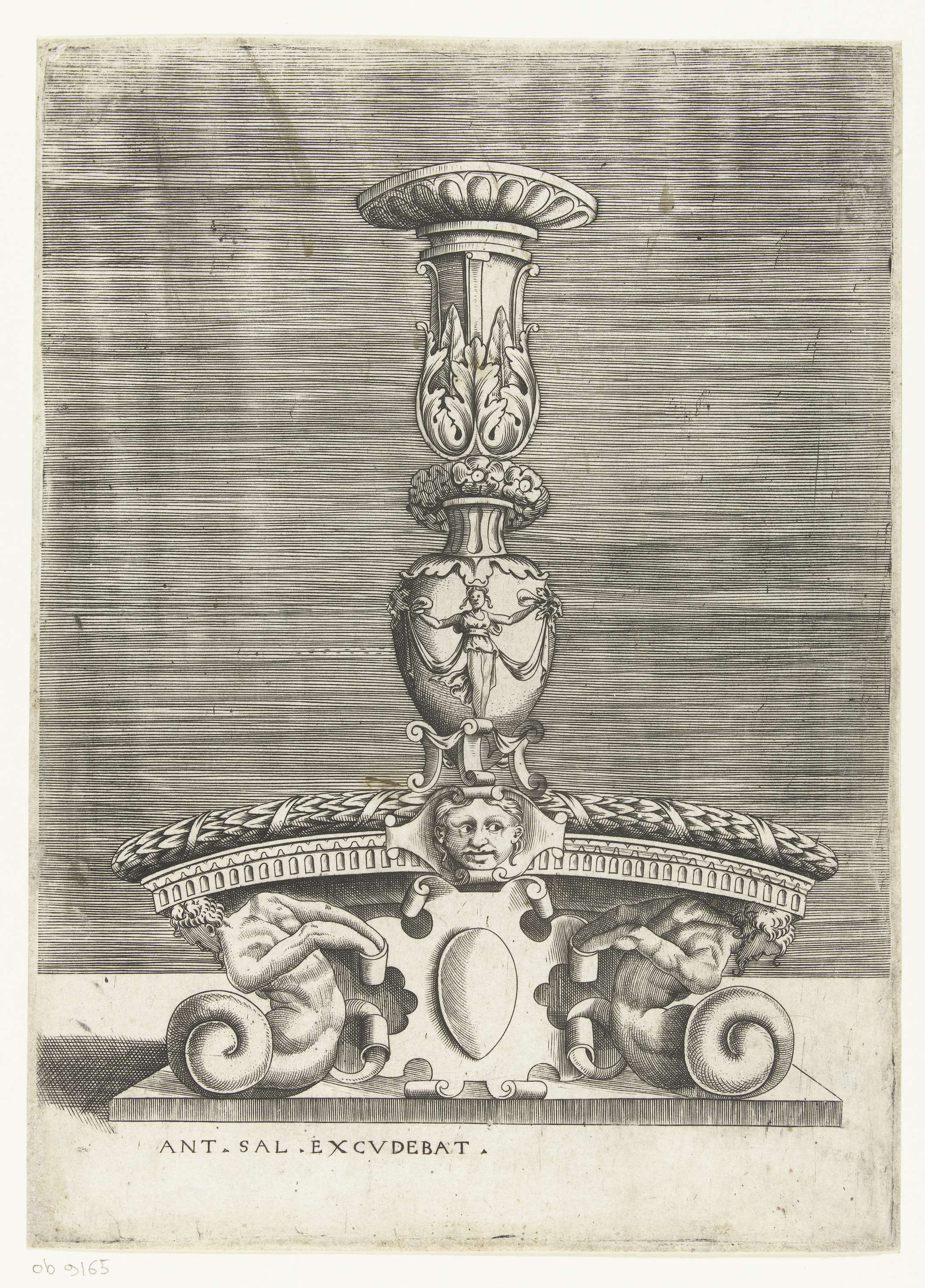 Kandelaar op een voet, gedecoreerd met mascarons en ...