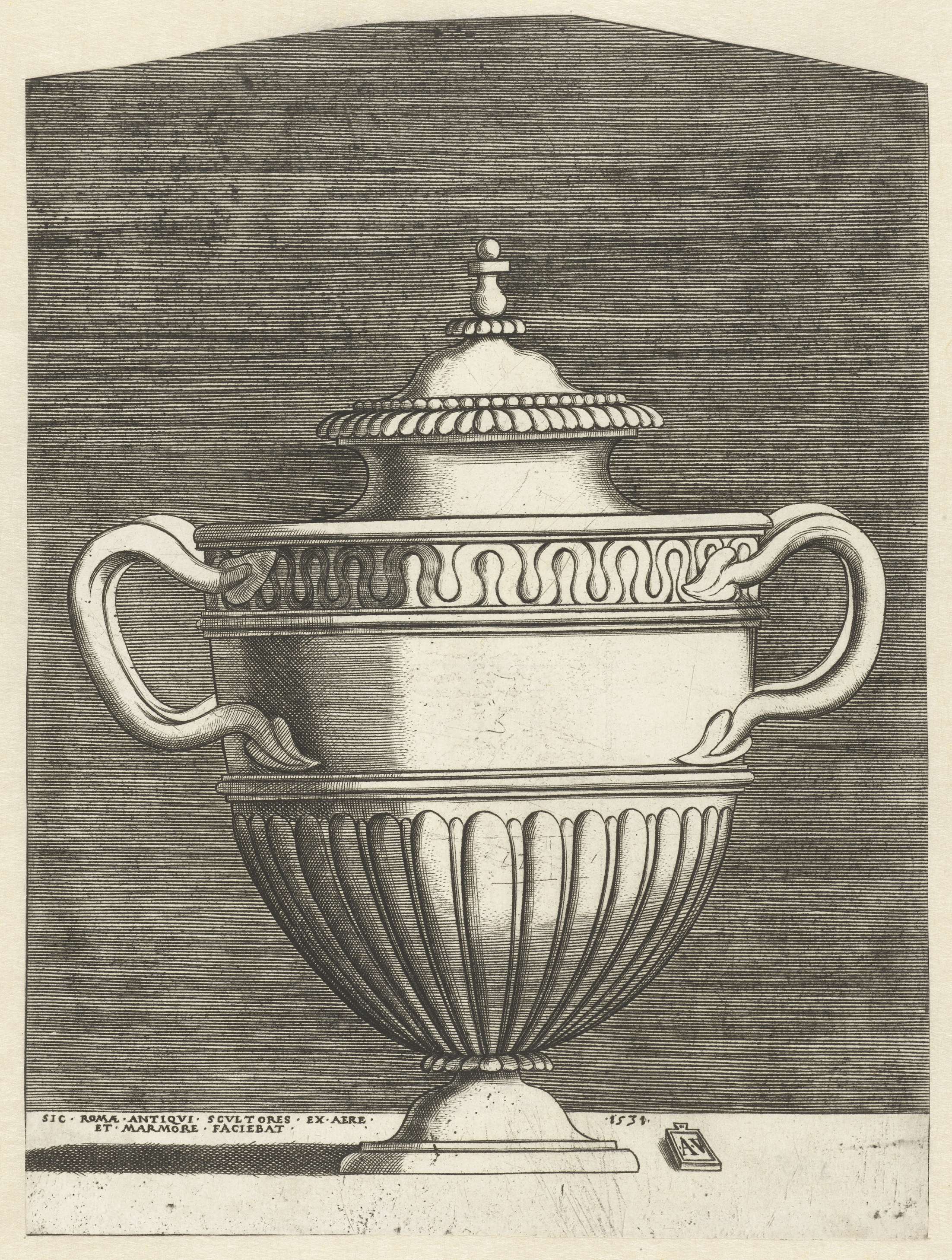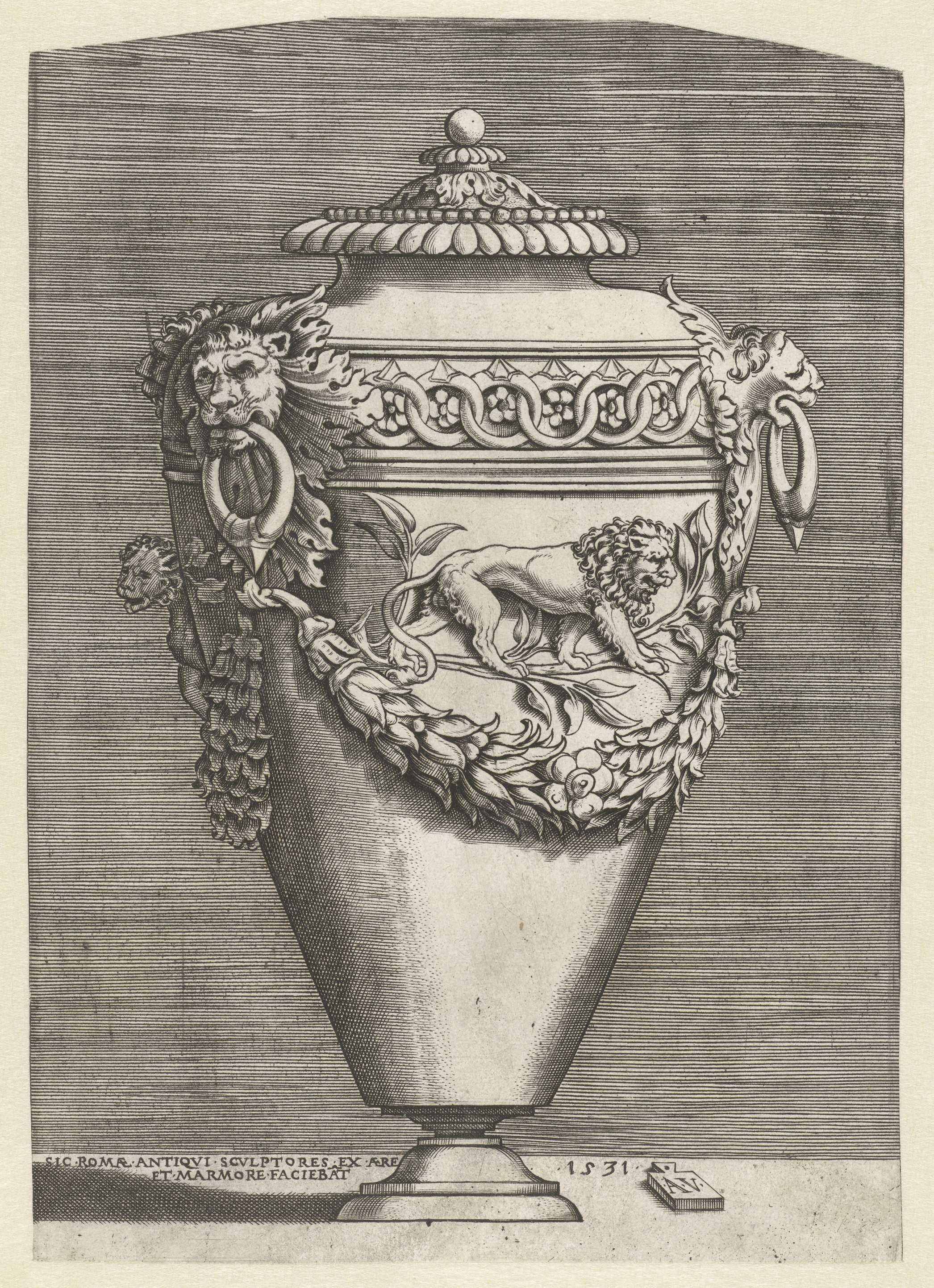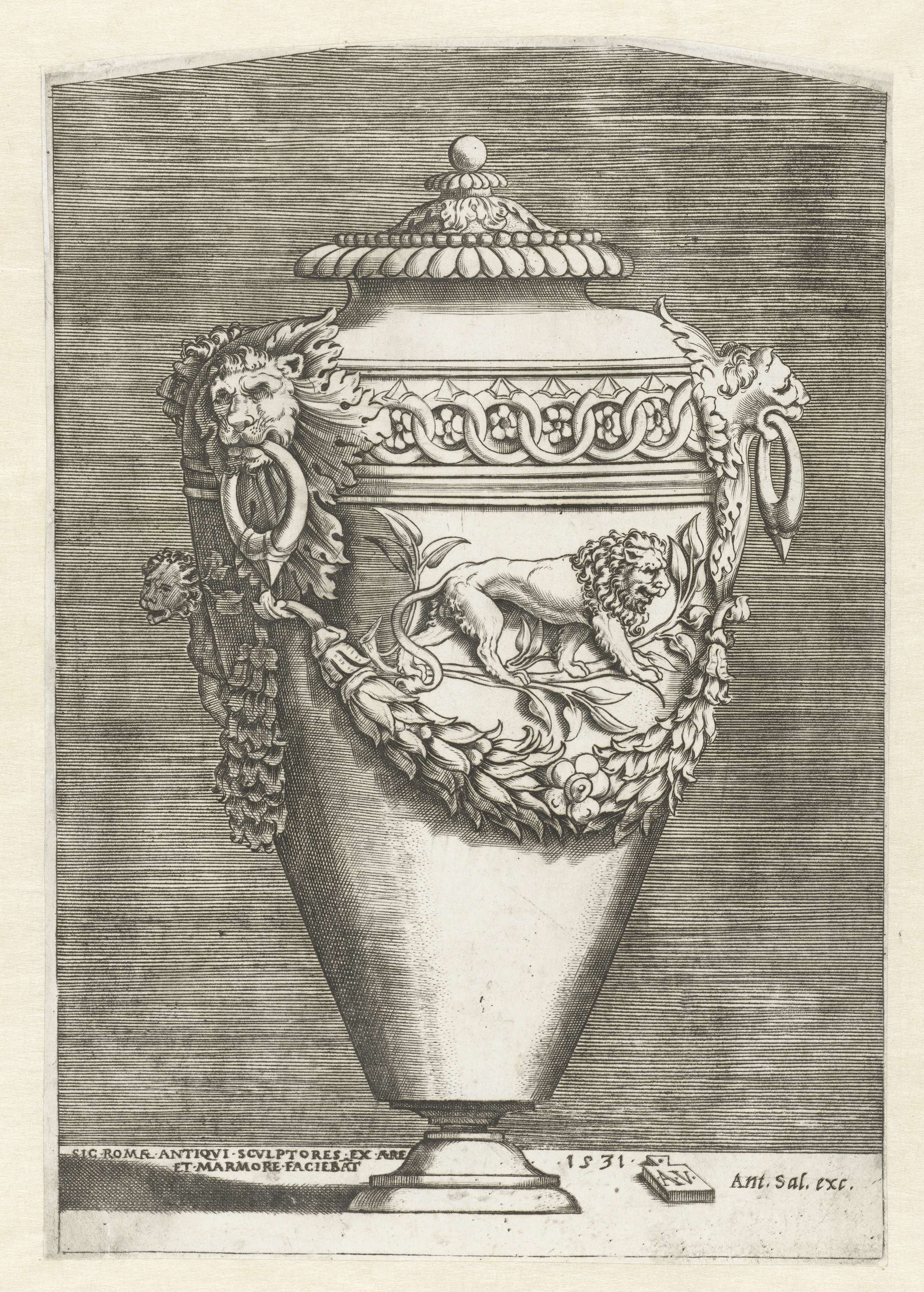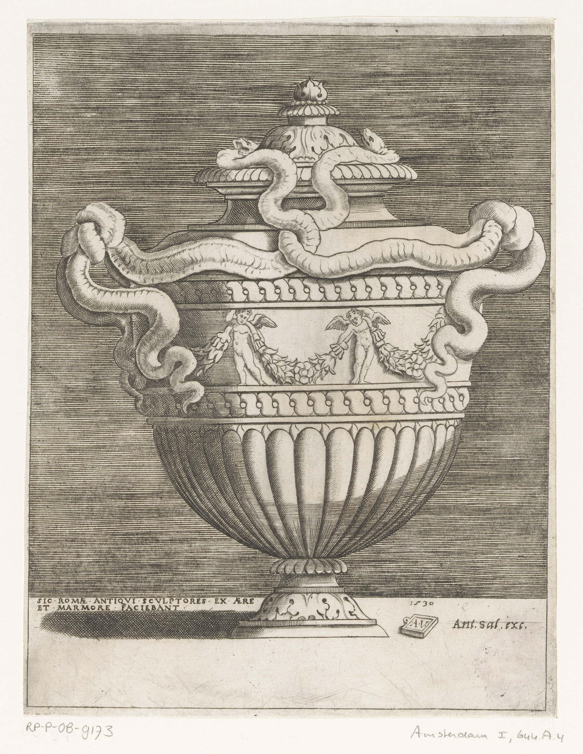 Kandelaar op een voet, gedecoreerd met mascarons en ...