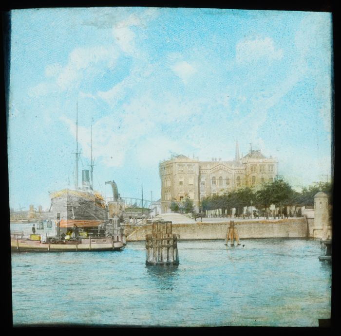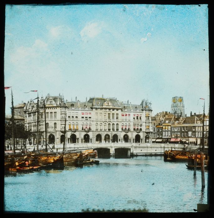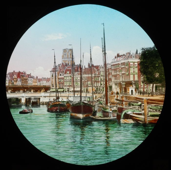 Handgekleurde glasdia van Oude Haven met Plan C