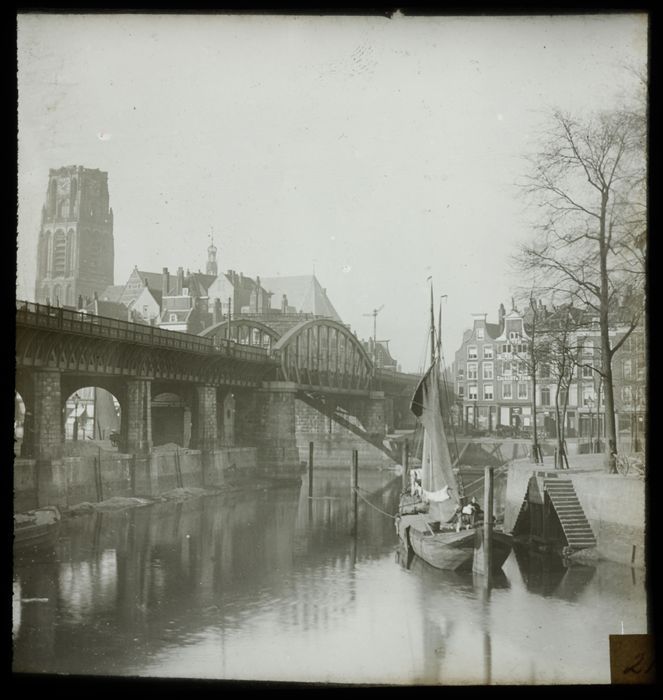 Glasdia van Kolkkade met spoorbrug en Laurenskerk
