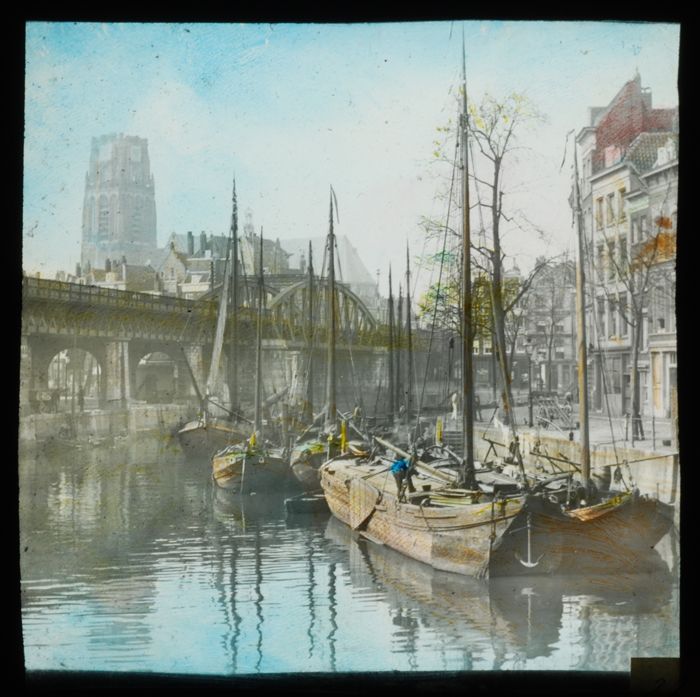 Glasdia van de Schiekade met spoorbrug en boten