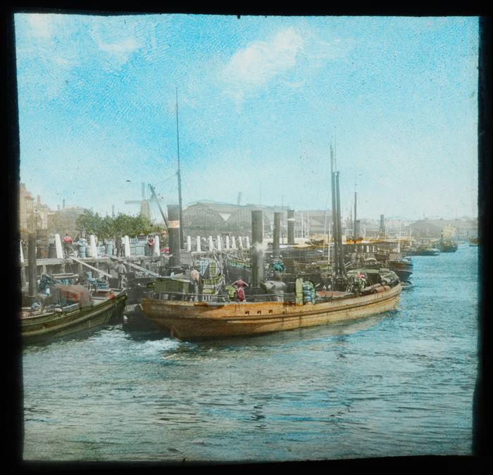 Handgekleurde glasdia van Maas met schepen en Maasst...