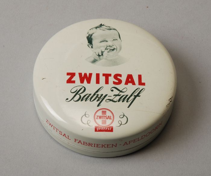Wit cilindrisch blik, met los deksel waarop "Zwitsal...
