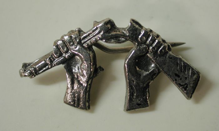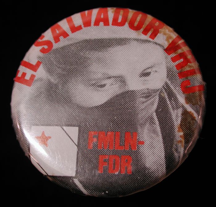 Button "El Salvador vrij" en foto van vrouw met doek...