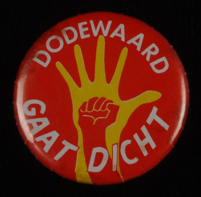 Button (rood) "Dodewaard gaat dicht" met vuist en hand