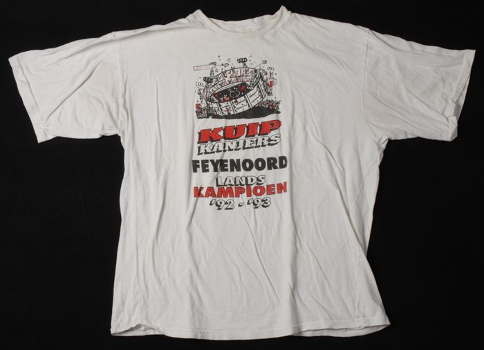 Wit t-shirt met opdruk in rood en zwart van het voet...