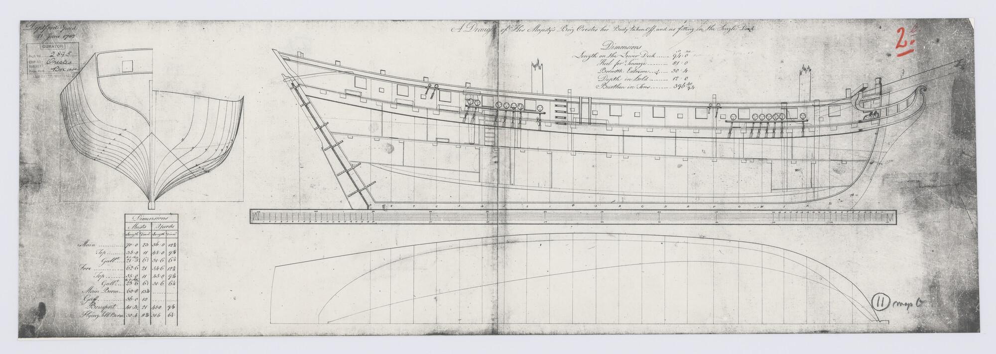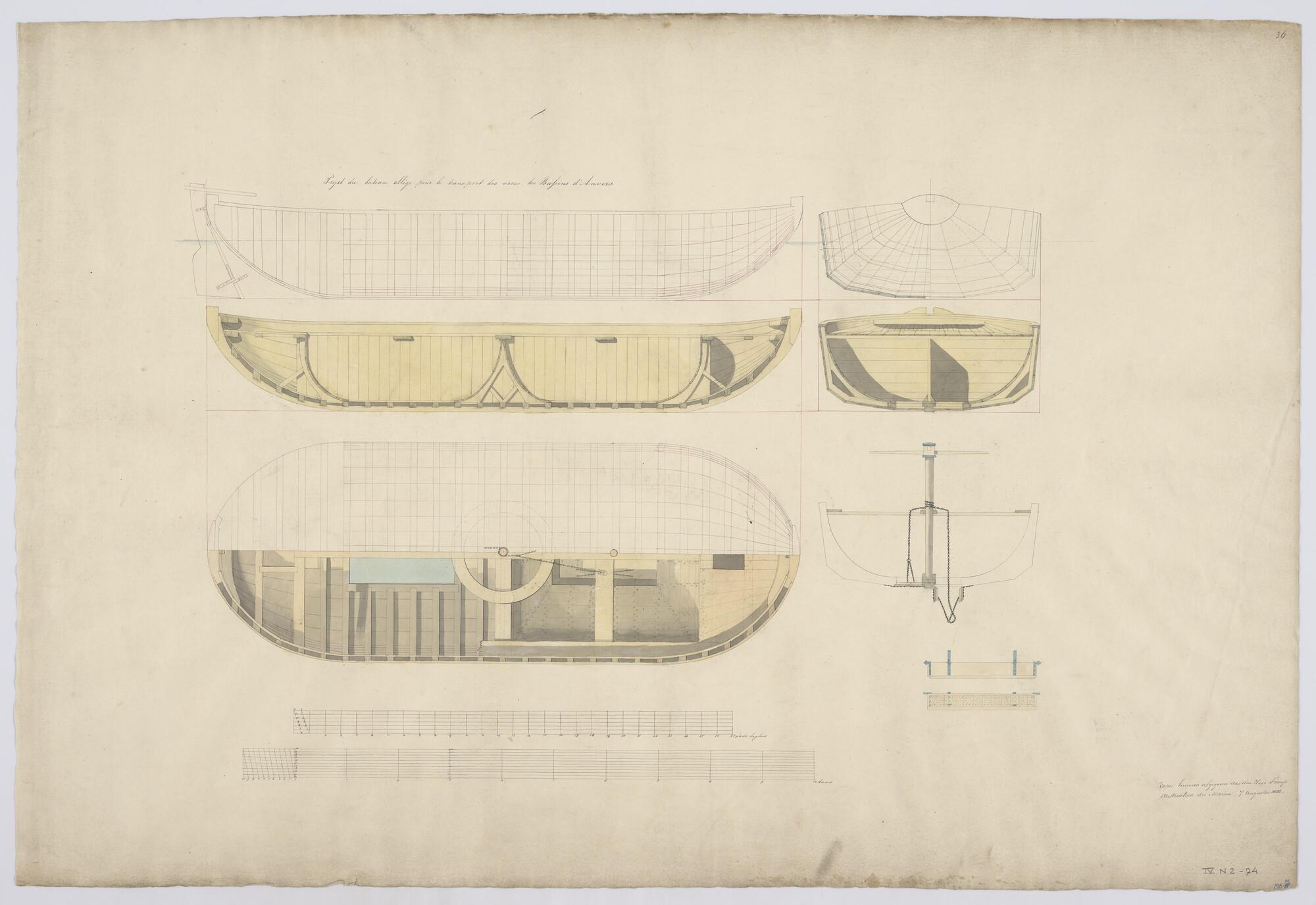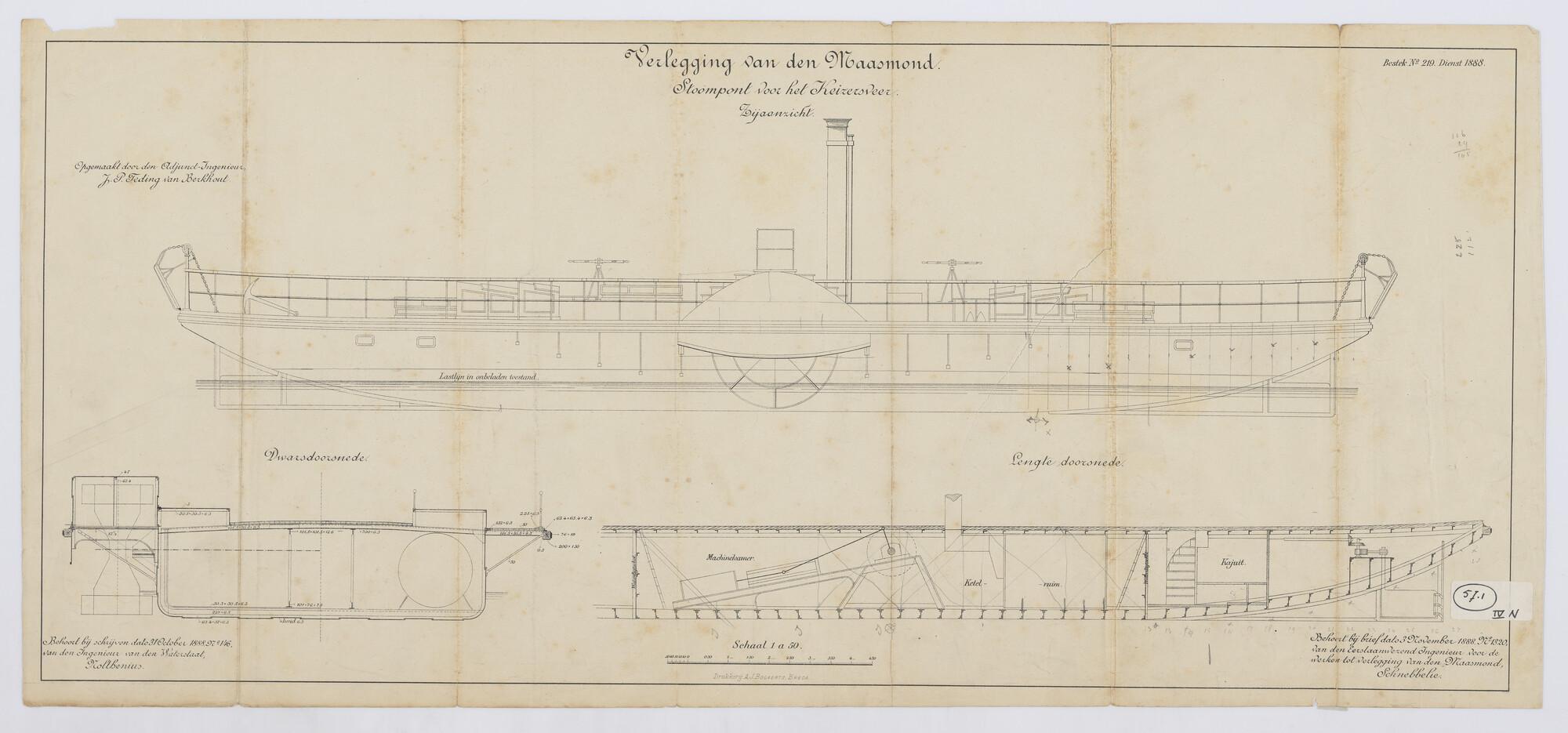 Verticale langsdoorsnede, bovenaanzicht, spantenraam...