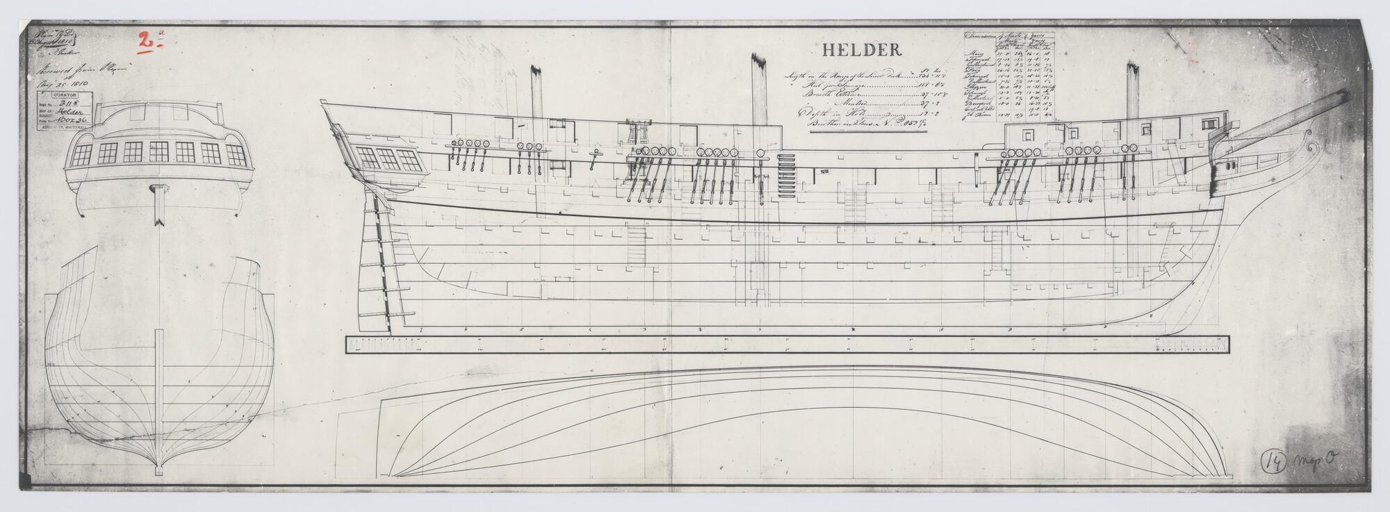 Oorlogsschip Helder: achteraanzicht, spantenraam en ...