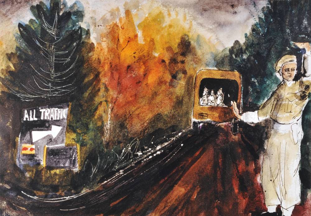 Aquarel 'Canadese vrouwelijke soldaat regelt een mil...