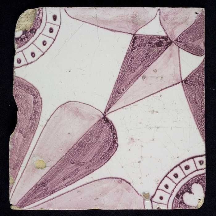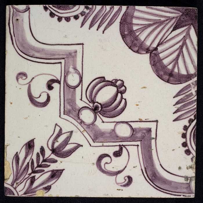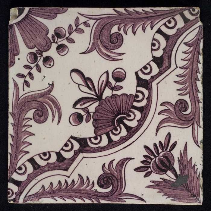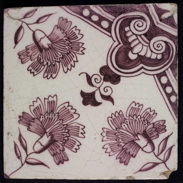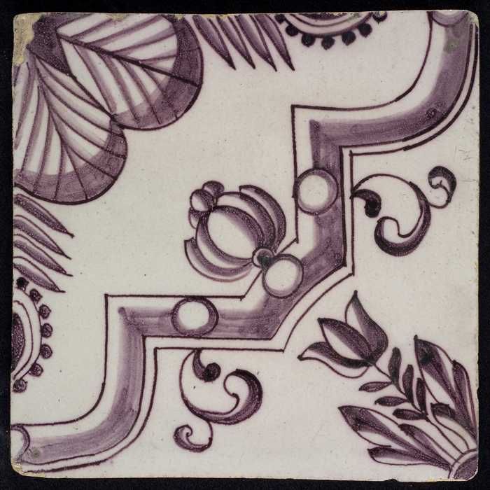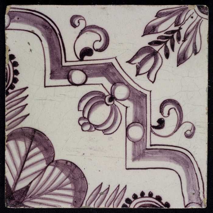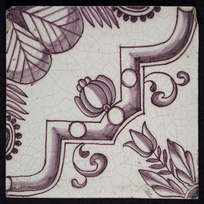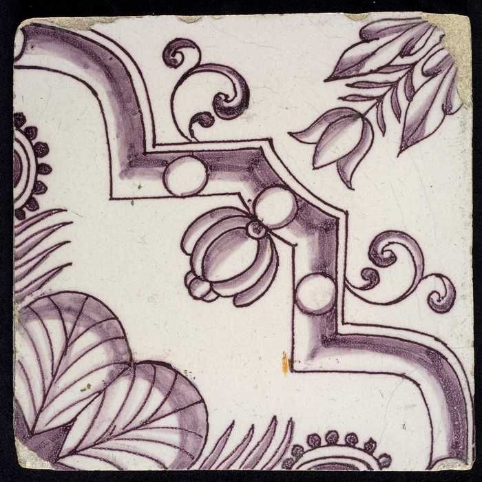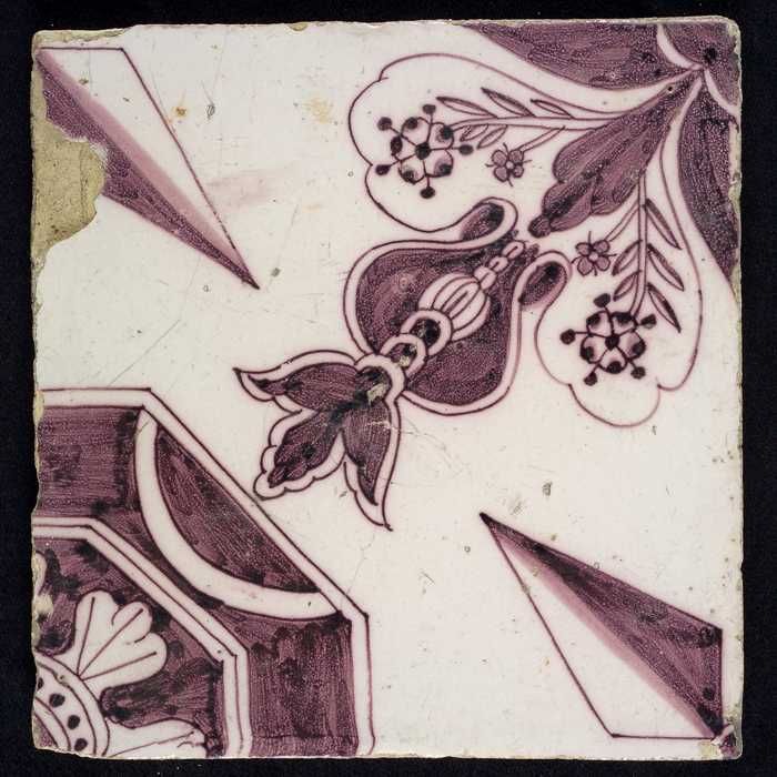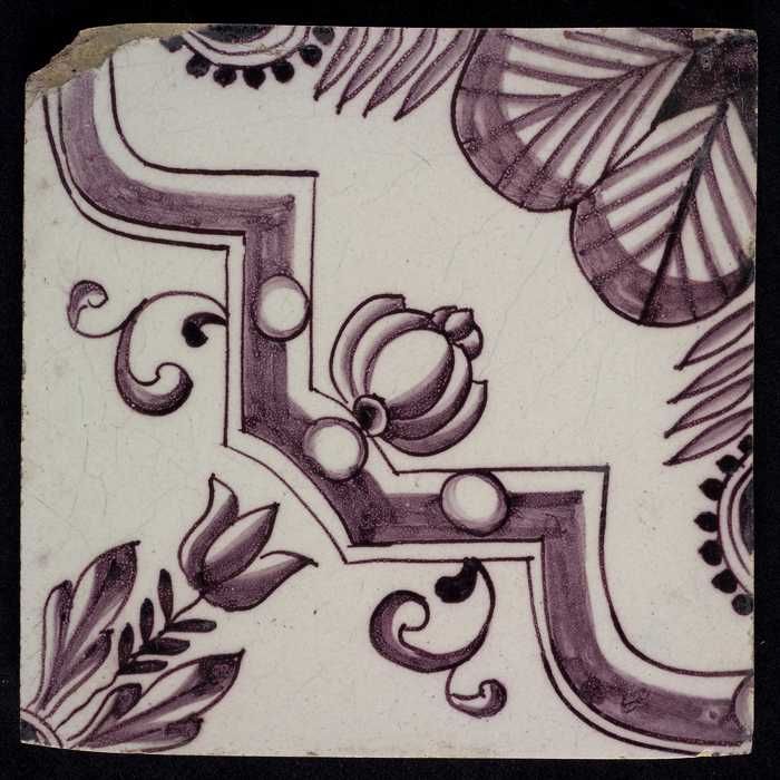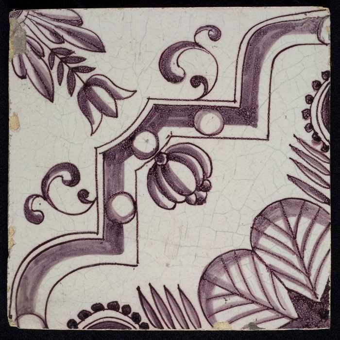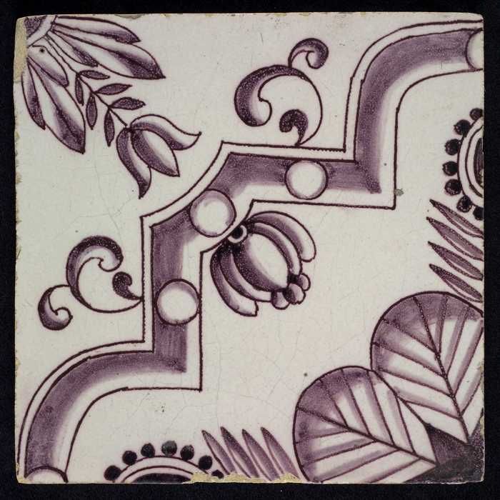 Ornamenttegel, paars op wit, centraal hoekmotief en ...