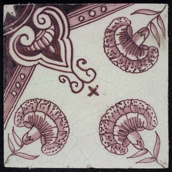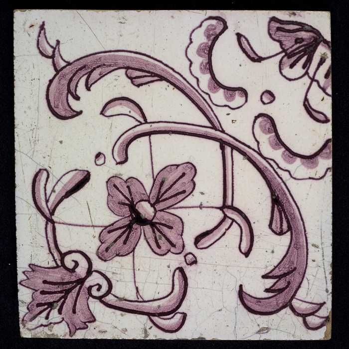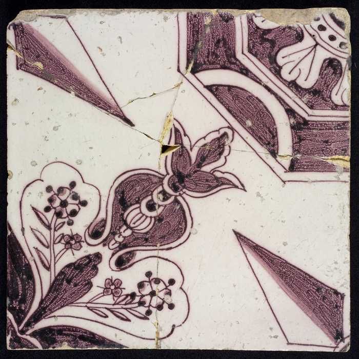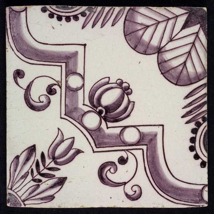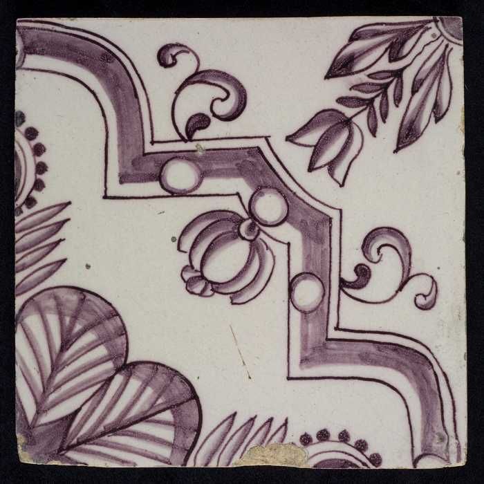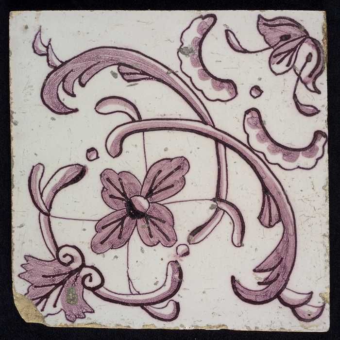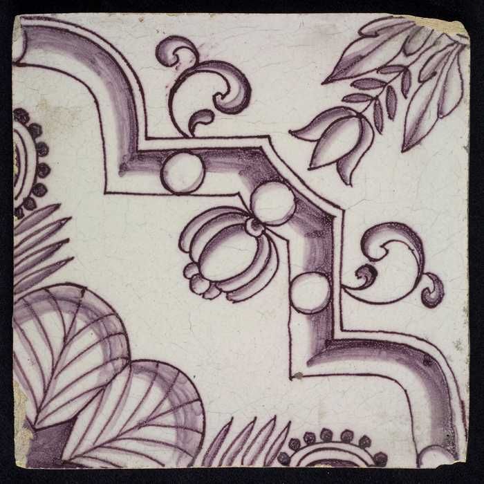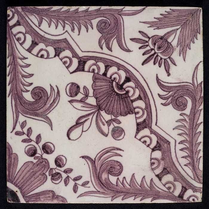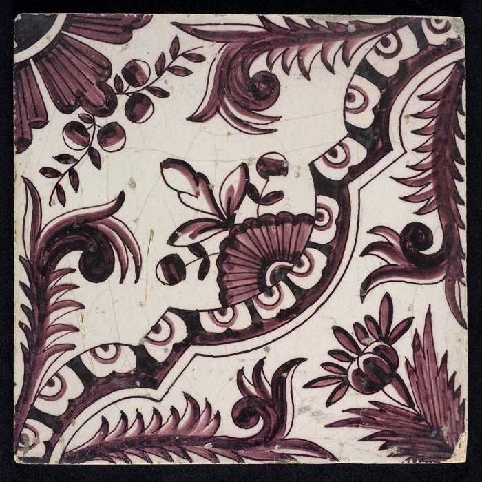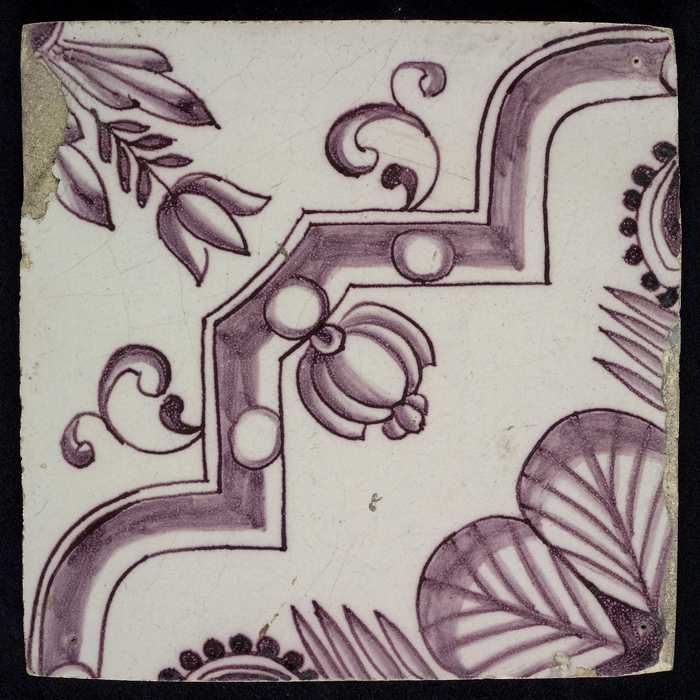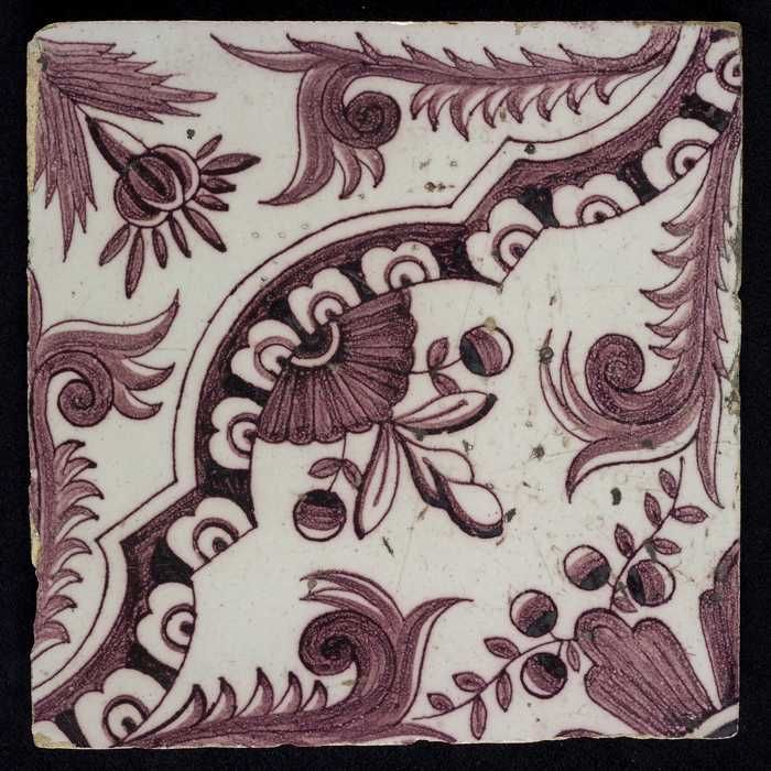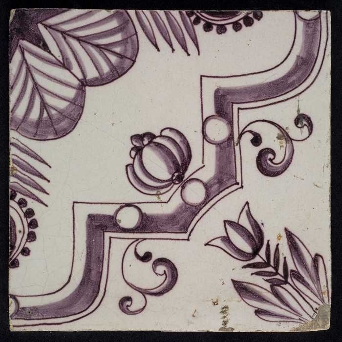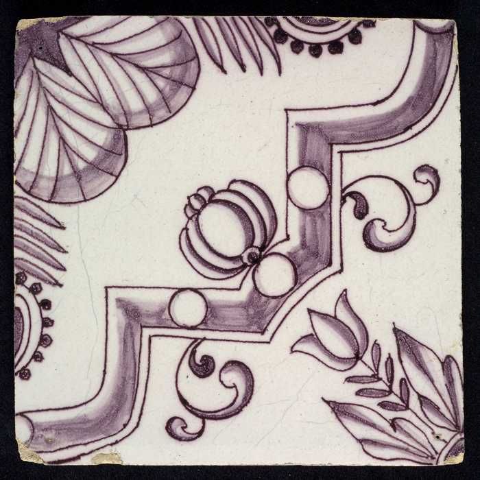 Ornamenttegel, paars op wit, centraal hoekmotief en ...
