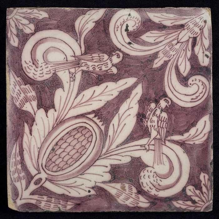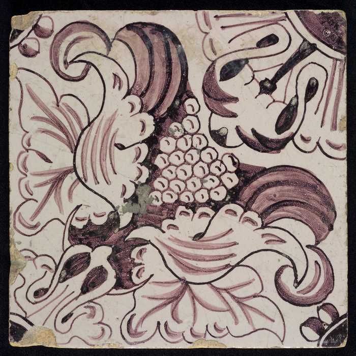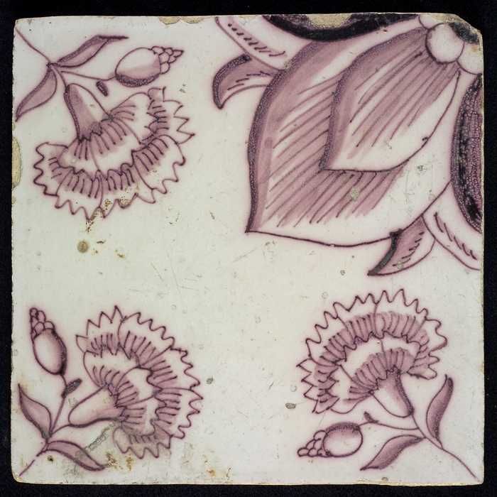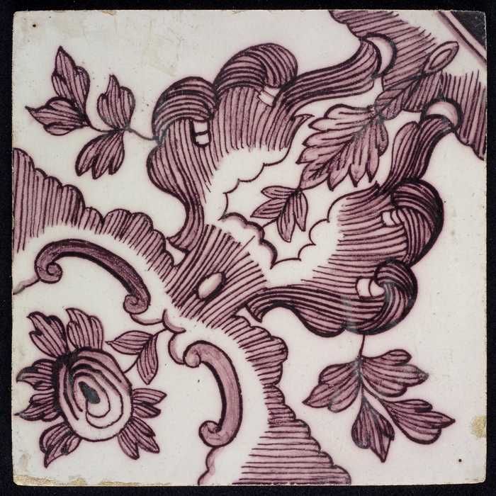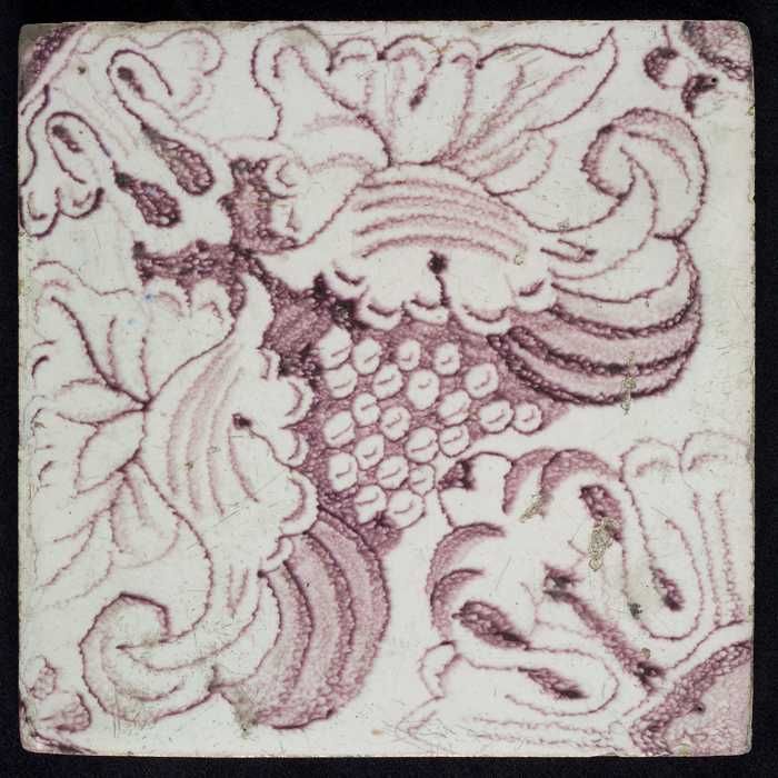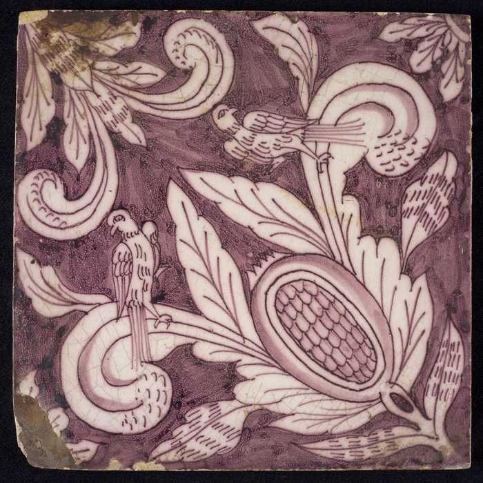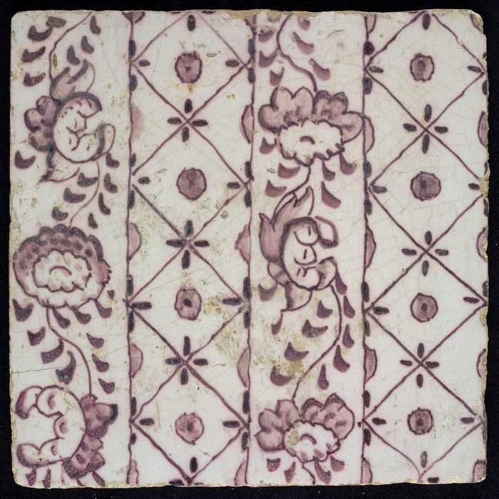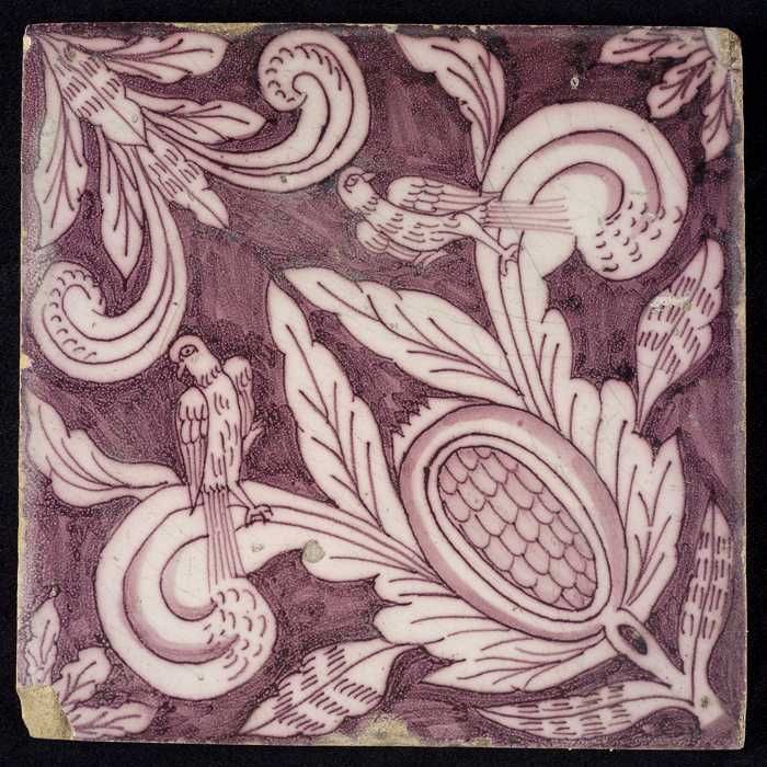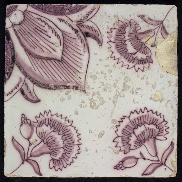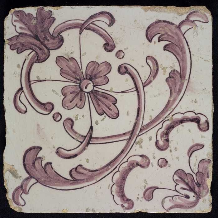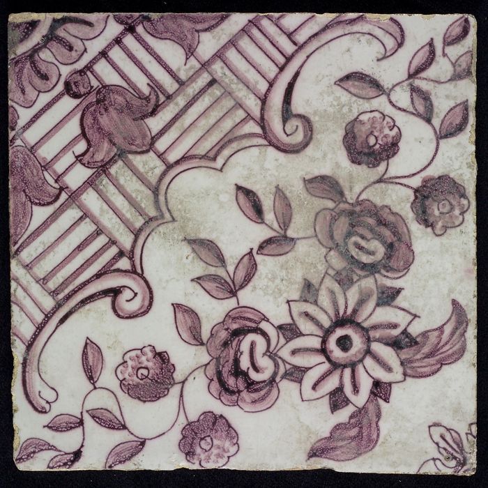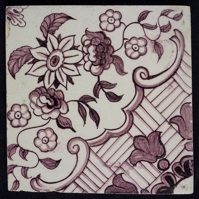 Ornamenttegel, paars op wit, centraal hoekmotief en ...