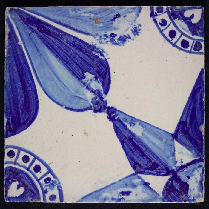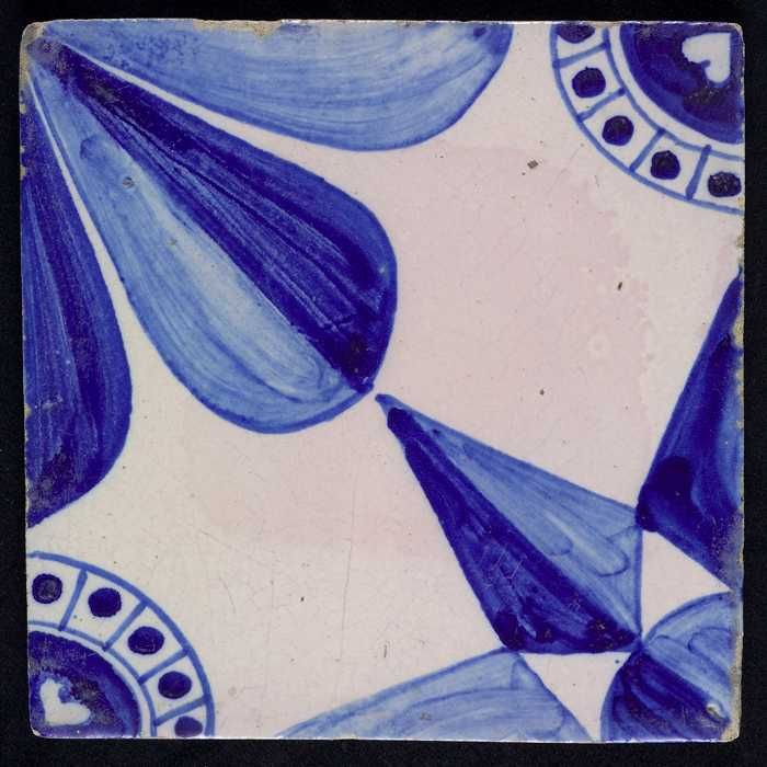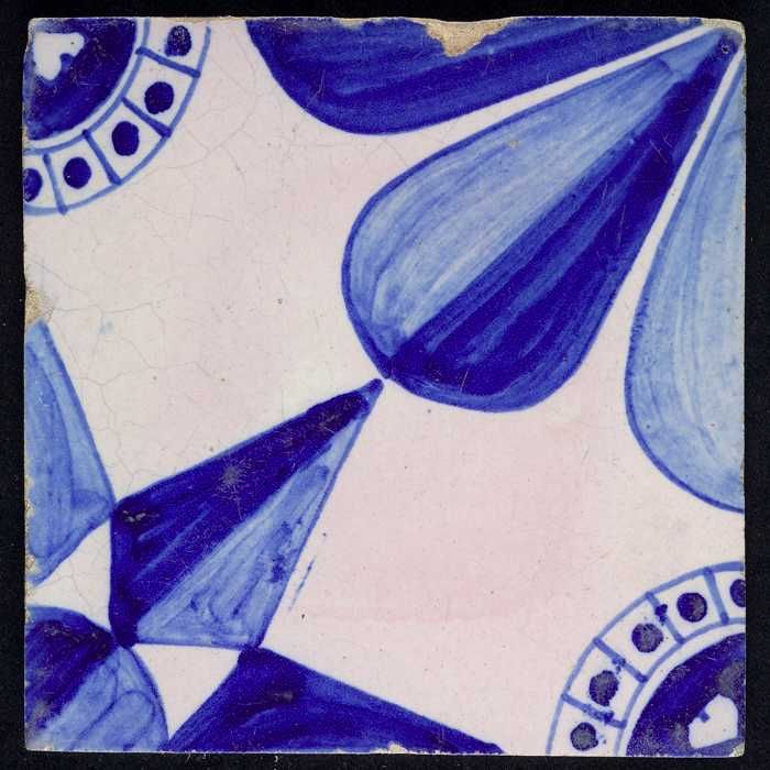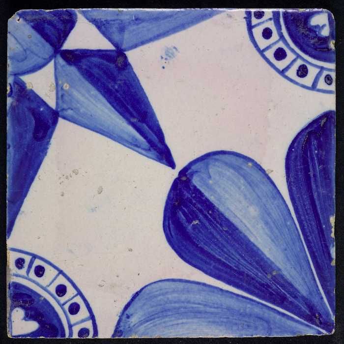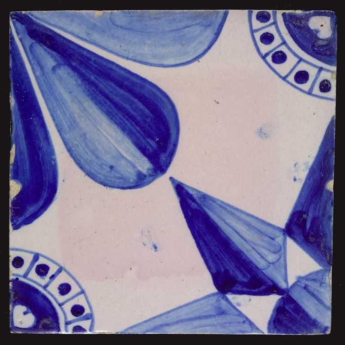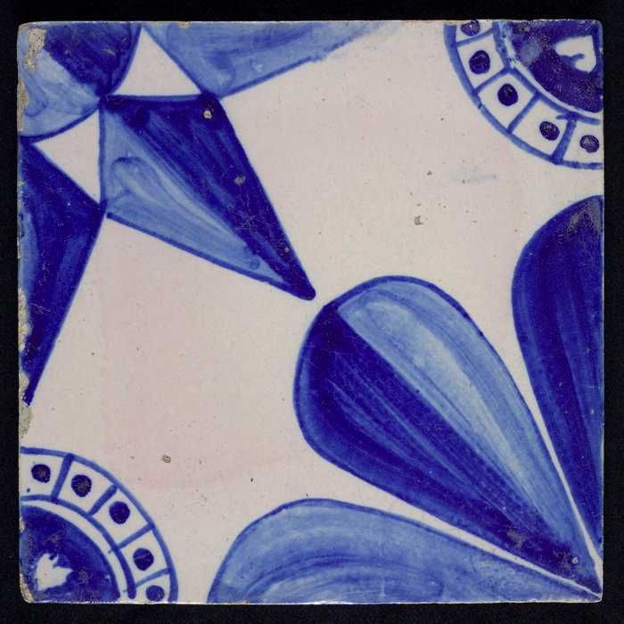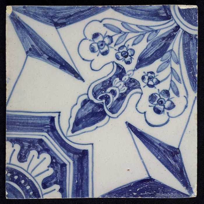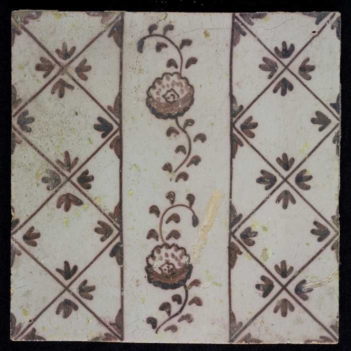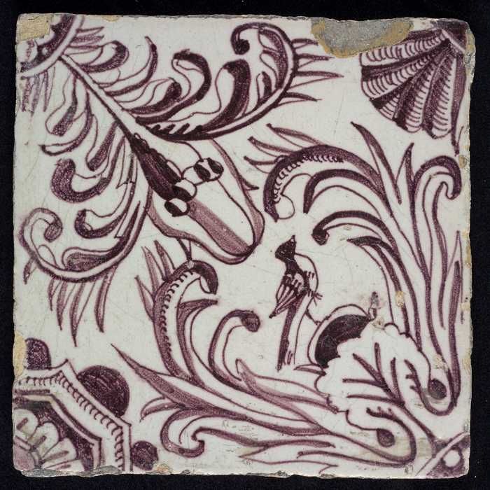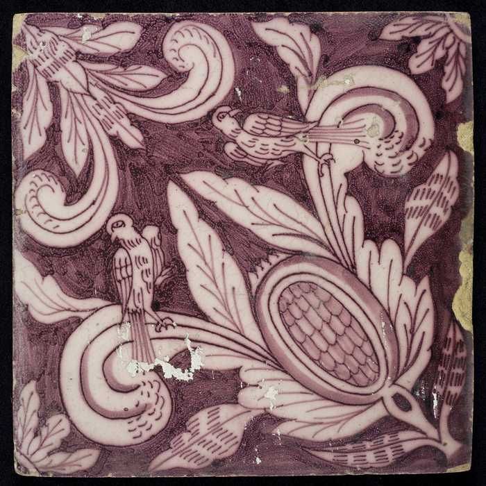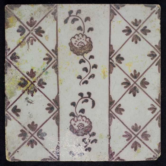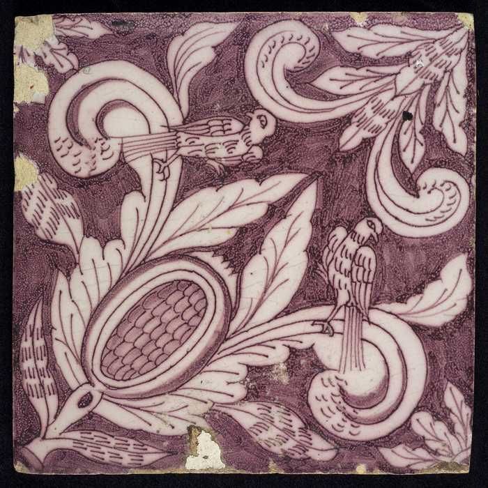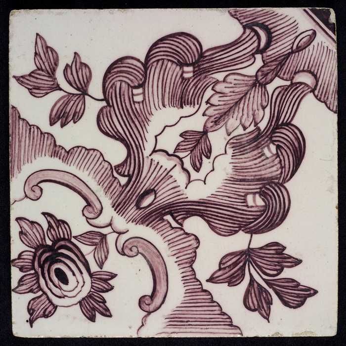 Ornamenttegel, paars op wit, centraal hoekmotief en ...