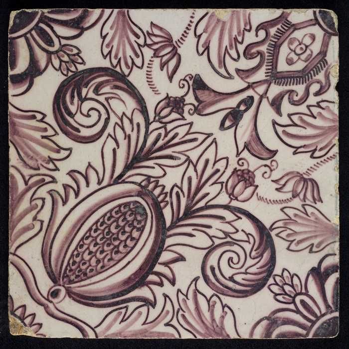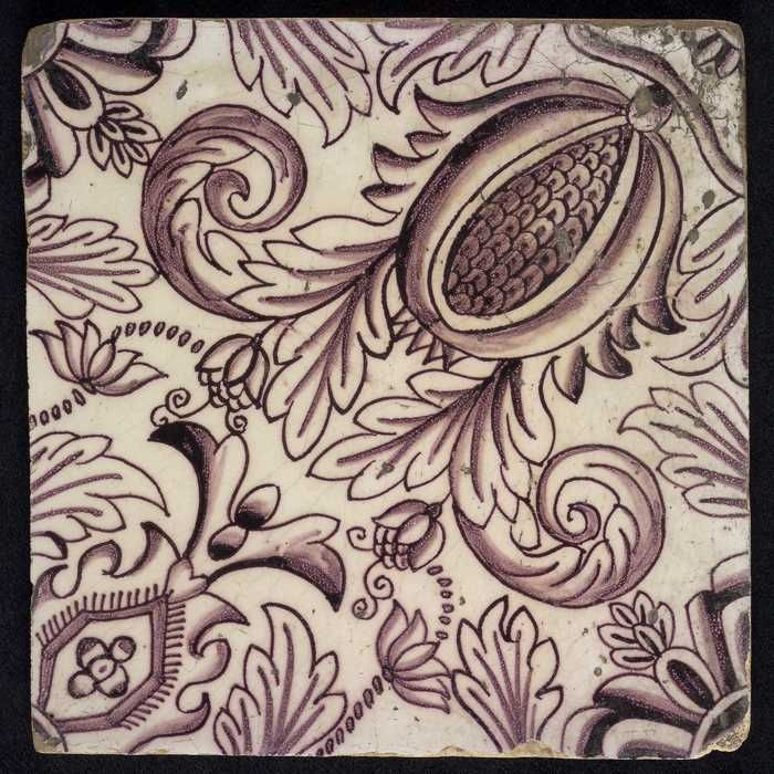 Ornamenttegel, paars op wit, granaatbloem met bladeren