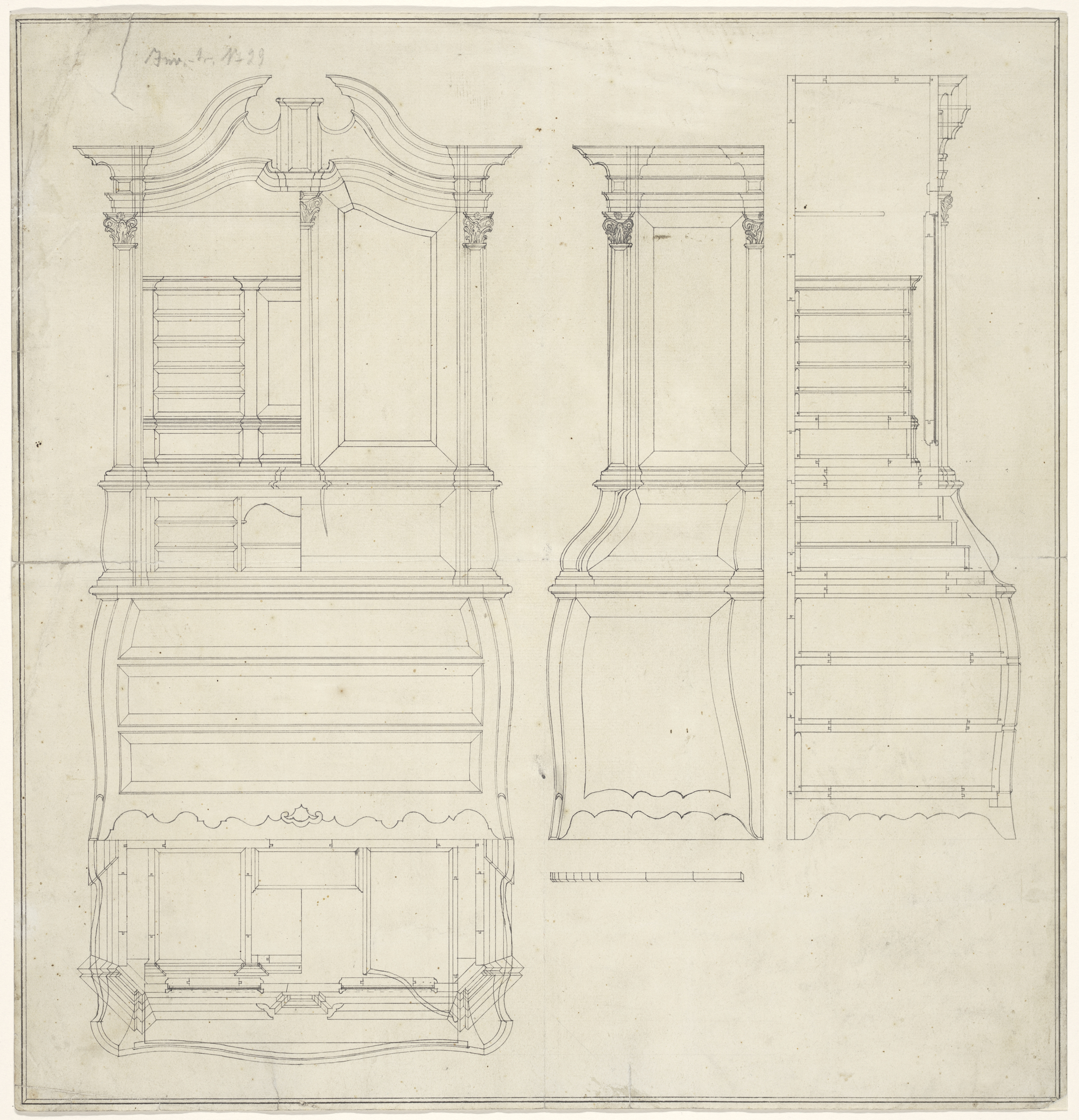 Ontwerp voor twee hoekkasten, met daaronder plattegr...